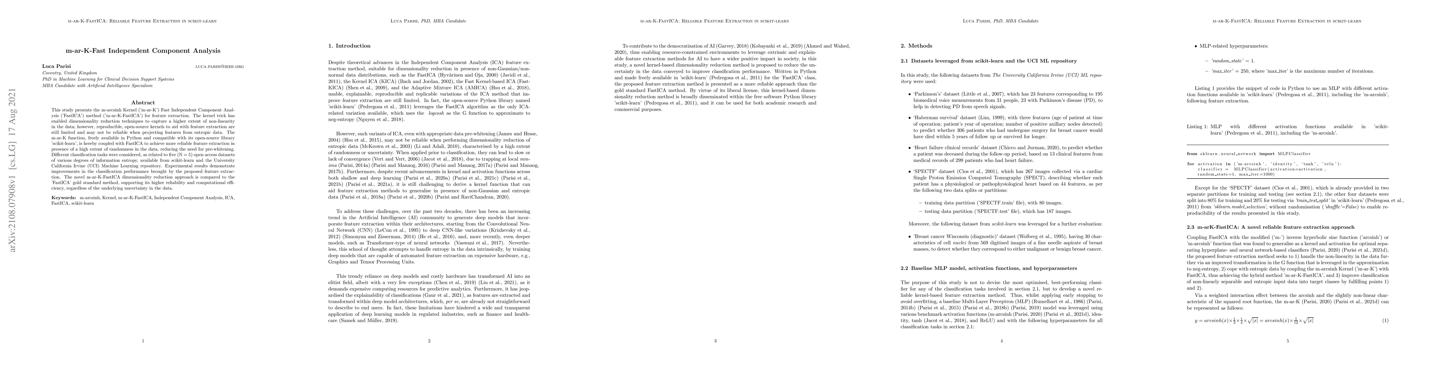 This study presents the m-arcsinh Kernel ('m-ar-K') Fast Independent Component Analysis ('FastICA') method ('m-ar-K-FastICA') for feature extraction. The kernel trick has enabled dimensionality reduction techniques to capture a higher extent of non-linearity in the data; however, reproducible, open-source kernels to aid with feature extraction are still limited and may not be reliable when projecting features from entropic data. The m-ar-K function, freely available in Python and compatible with its open-source library 'scikit-learn', is hereby coupled with FastICA to achieve more reliable feature extraction in presence of a high extent of randomness in the data, reducing the need for pre-whitening. Different classification tasks were considered, as related to five (N = 5) open access datasets of various degrees of information entropy, available from scikit-learn and the University California Irvine (UCI) Machine Learning repository. Experimental results demonstrate improvements in the classification performance brought by the proposed feature extraction. The novel m-ar-K-FastICA dimensionality reduction approach is compared to the 'FastICA' gold standard method, supporting its higher reliability and computational efficiency, regardless of the underlying uncertainty in the data.