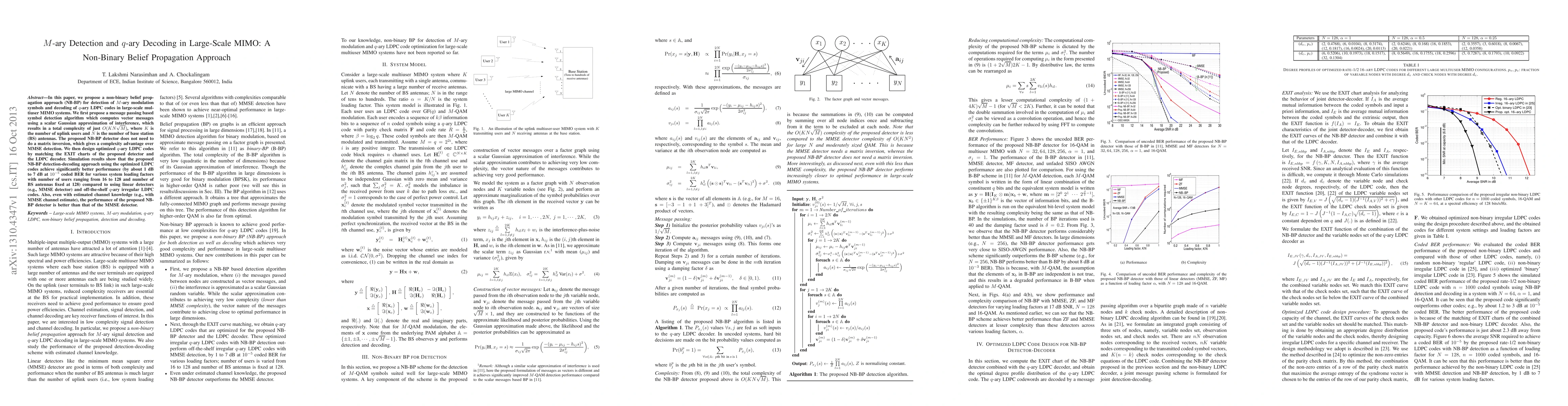 In this paper, we propose a non-binary belief propagation approach (NB-BP) for detection of $M$-ary modulation symbols and decoding of $q$-ary LDPC codes in large-scale multiuser MIMO systems. We first propose a message passing based symbol detection algorithm which computes vector messages using a scalar Gaussian approximation of interference, which results in a total complexity of just $O(KN\sqrt{M})$, where $K$ is the number of uplink users and $N$ is the number of base station (BS) antennas. The proposed NB-BP detector does not need to do a matrix inversion, which gives a complexity advantage over MMSE detection. We then design optimized $q$-ary LDPC codes by matching the EXIT charts of the proposed detector and the LDPC decoder. Simulation results show that the proposed NB-BP detection-decoding approach using the optimized LDPC codes achieve significantly better performance (by about 1 dB to 7 dB at $10^{-5}$ coded BER for various system loading factors with number of users ranging from 16 to 128 and number of BS antennas fixed at 128) compared to using linear detectors (e.g., MMSE detector) and off-the-shelf $q$-ary irregular LDPC codes. Also, even with estimated channel knowledge (e.g., with MMSE channel estimate), the performance of the proposed NB-BP detector is better than that of the MMSE detector.