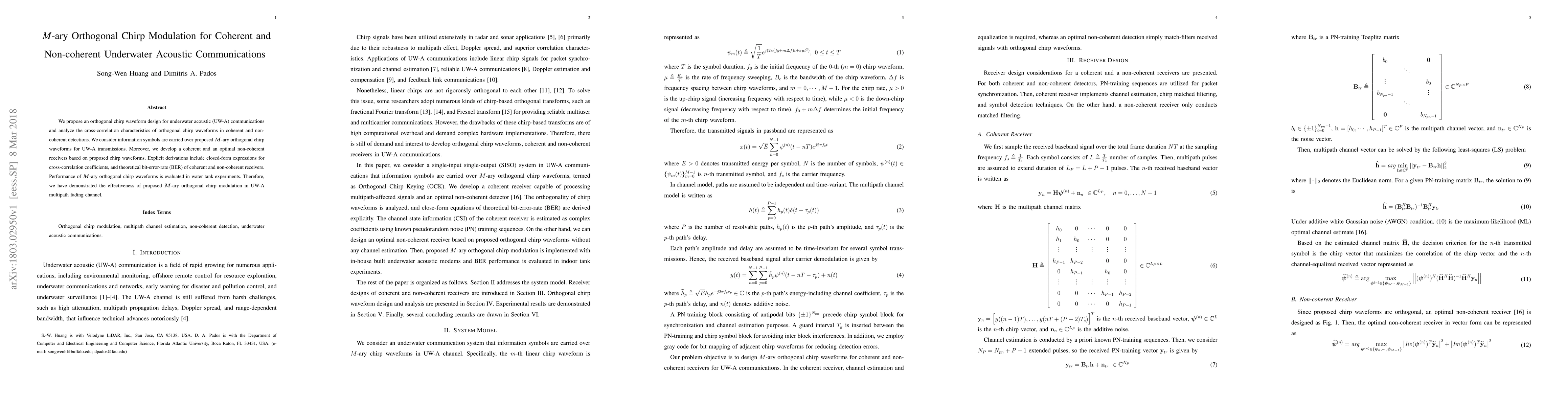 This paper proposes M-ary orthogonal chirp modulation for underwater acoustic communications, analyzing its cross-correlation characteristics and developing coherent and non-coherent receivers. Experimental results in a water tank validate the effectiveness of the proposed modulation in multipath fading channels.