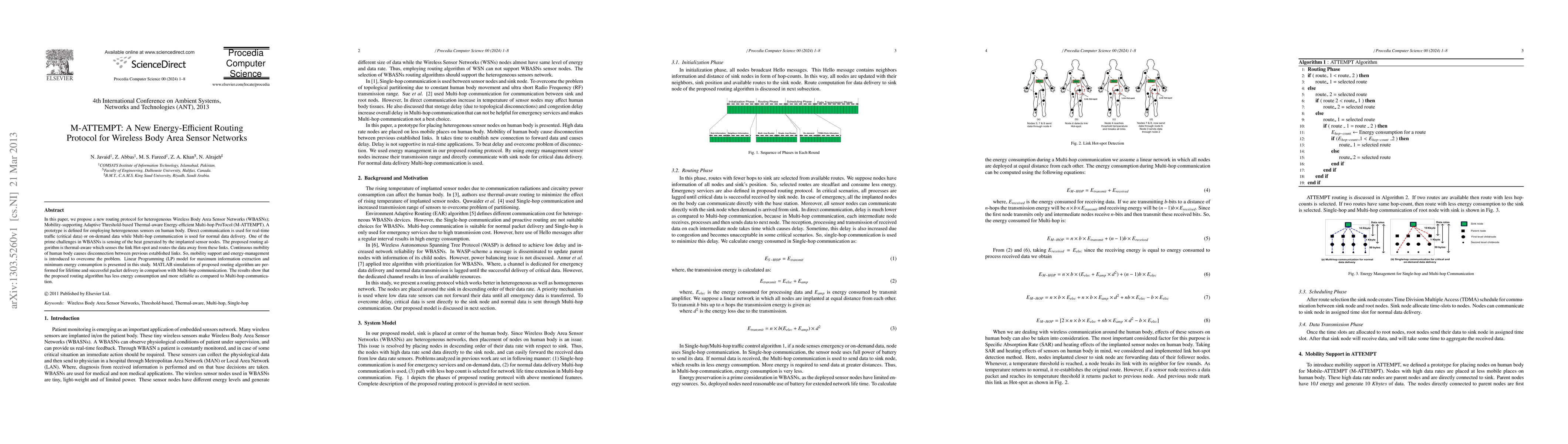This paper proposes M-ATTEMPT, an energy-efficient routing protocol for heterogeneous Wireless Body Area Sensor Networks, which uses adaptive thermal-awareness and mobility support to manage energy consumption and improve data delivery reliability. Simulation results indicate M-ATTEMPT outperforms Multi-hop communication in terms of energy efficiency and packet delivery success.