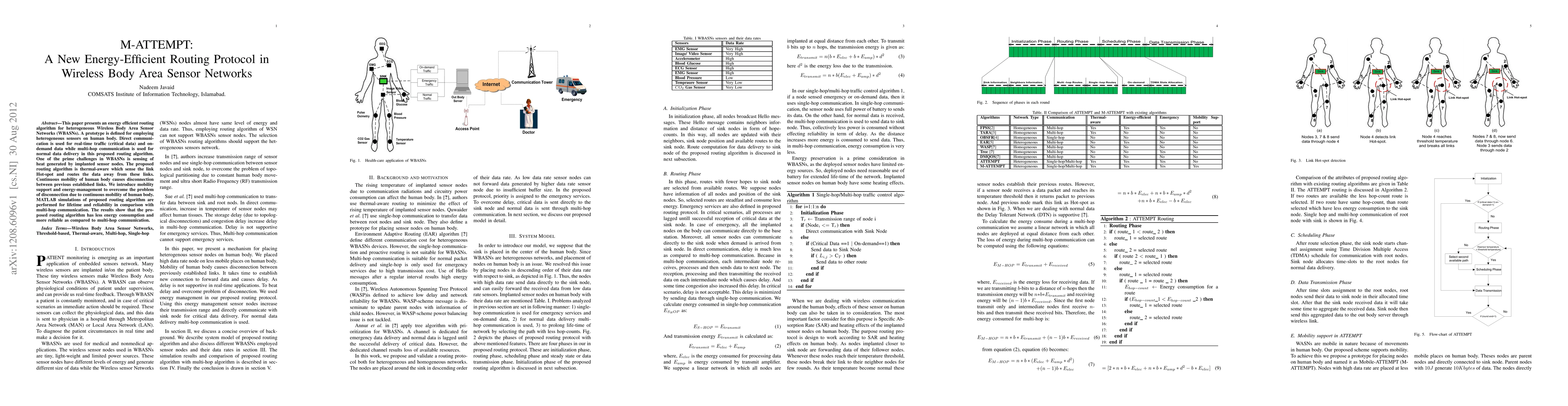 This paper introduces M-ATTEMPT, an energy-efficient routing protocol for heterogeneous Wireless Body Area Sensor Networks, which uses thermal-awareness and mobility support to manage energy consumption and reliability. Simulation results show it outperforms multi-hop communication in terms of energy efficiency and reliability.