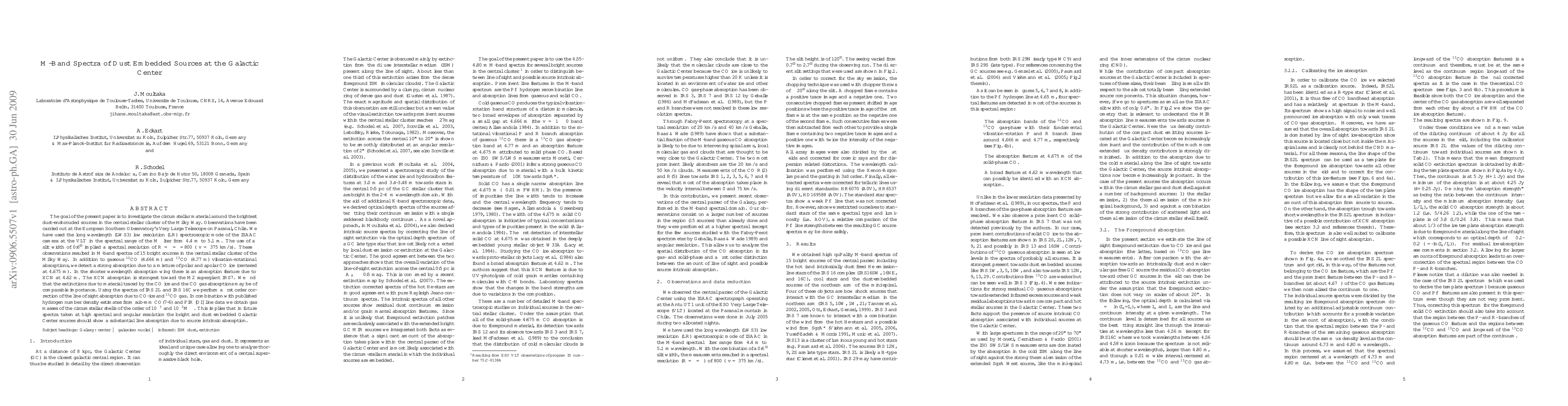 This paper investigates the circumstellar material around bright, dust-enshrouded sources in the Milky Way's central cluster using M-band spectra from the VLT. The study identifies absorption features from CO ice, CO gas, and XCN, and estimates circumstellar gas masses of 10^-3 to 10^-2 solar masses.