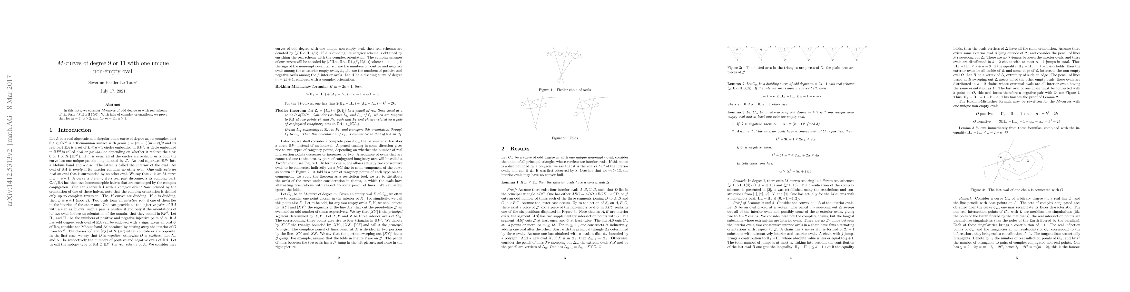 In this note, we consider M-curves of odd degree with real scheme of the form $< \mathcal{J} \amalg \alpha \amalg 1 < \beta > >$. With help of complex orientations, we prove that for $m = 9$, $\alpha \geq 2$, and for $m = 11$, $\alpha \geq 3$.