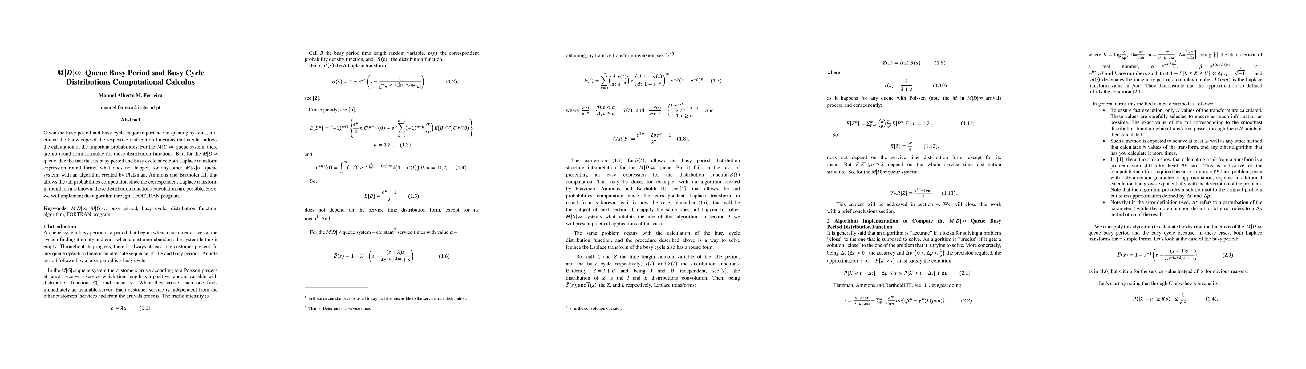 Researchers developed a FORTRAN program to calculate distribution functions for the M|D|$ty$ queue system, enabling computation of busy period and cycle probabilities through Laplace transform expressions. This method provides a solution for tail probability calculations in queuing systems.