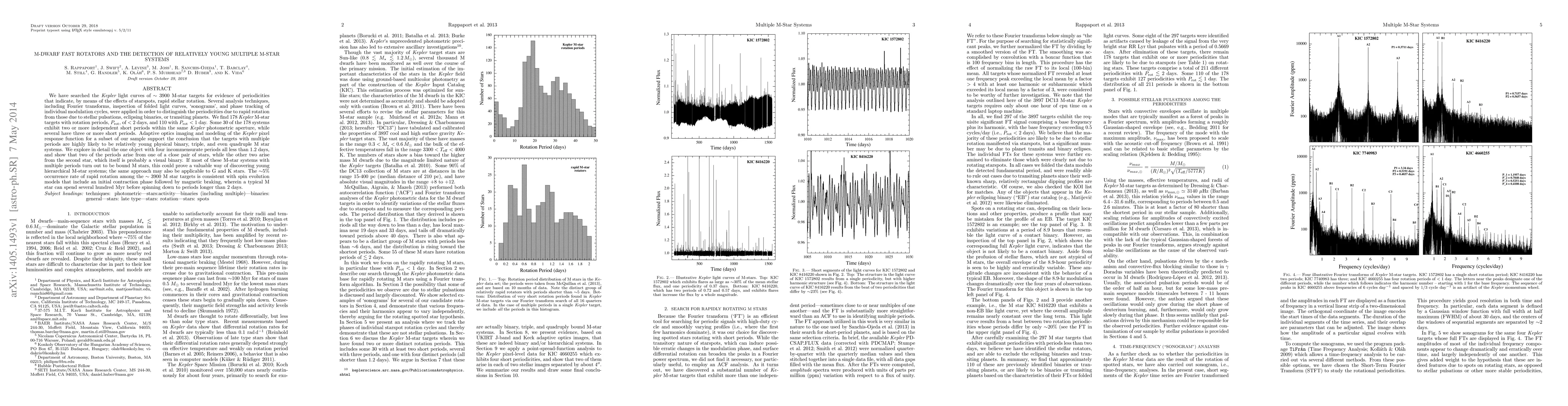 We have searched the Kepler light curves of ~3900 M-star targets for evidence of periodicities that indicate, by means of the effects of starspots, rapid stellar rotation. Several analysis techniques, including Fourier transforms, inspection of folded light curves, 'sonograms', and phase tracking of individual modulation cycles, were applied in order to distinguish the periodicities due to rapid rotation from those due to stellar pulsations, eclipsing binaries, or transiting planets. We find 178 Kepler M-star targets with rotation periods, P_rot, of < 2 days, and 110 with P_rot < 1 day. Some 30 of the 178 systems exhibit two or more independent short periods within the same Kepler photometric aperture, while several have three or more short periods. Adaptive optics imaging and modeling of the Kepler pixel response function for a subset of our sample support the conclusion that the targets with multiple periods are highly likely to be relatively young physical binary, triple, and even quadruple M star systems. We explore in detail the one object with four incommensurate periods all less than 1.2 days, and show that two of the periods arise from one of a close pair of stars, while the other two arise from the second star, which itself is probably a visual binary. If most of these M-star systems with multiple periods turn out to be bound M stars, this could prove a valuable way of discovering young hierarchical M-star systems; the same approach may also be applicable to G and K stars. The ~5% occurrence rate of rapid rotation among the ~3900 M star targets is consistent with spin evolution models that include an initial contraction phase followed by magnetic braking, wherein a typical M star can spend several hundred Myr before spinning down to periods longer than 2 days.