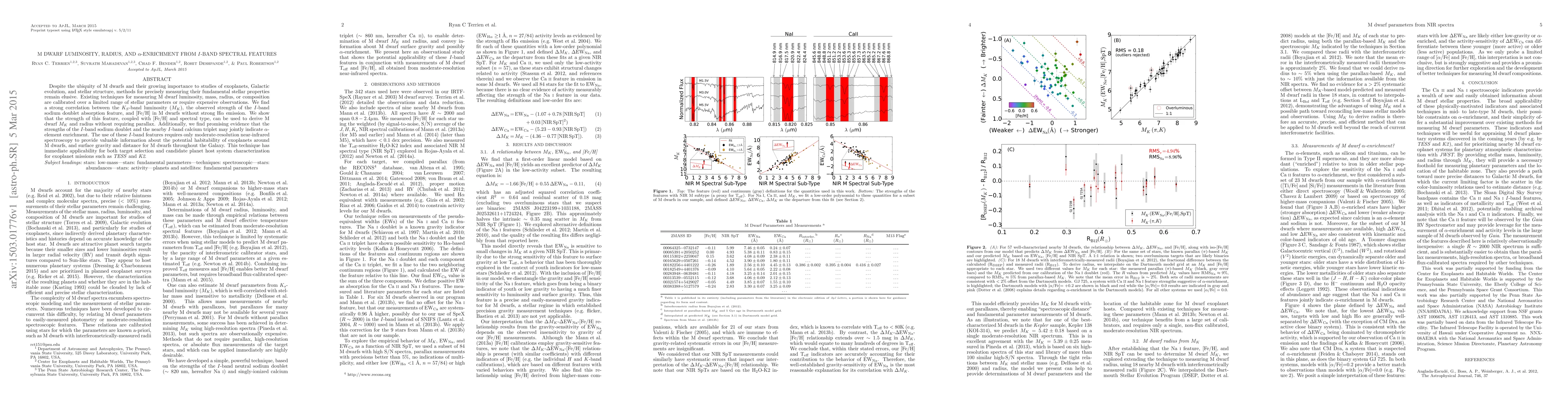 This paper presents a method to accurately measure M dwarf luminosity, radius, and $\alpha$-element enrichment using $I$-band spectral features, specifically the sodium doublet and calcium triplet. The technique leverages correlations between these features and stellar parameters, enabling precise measurements without requiring parallax, thus aiding exoplanet mission target selection and characterization.