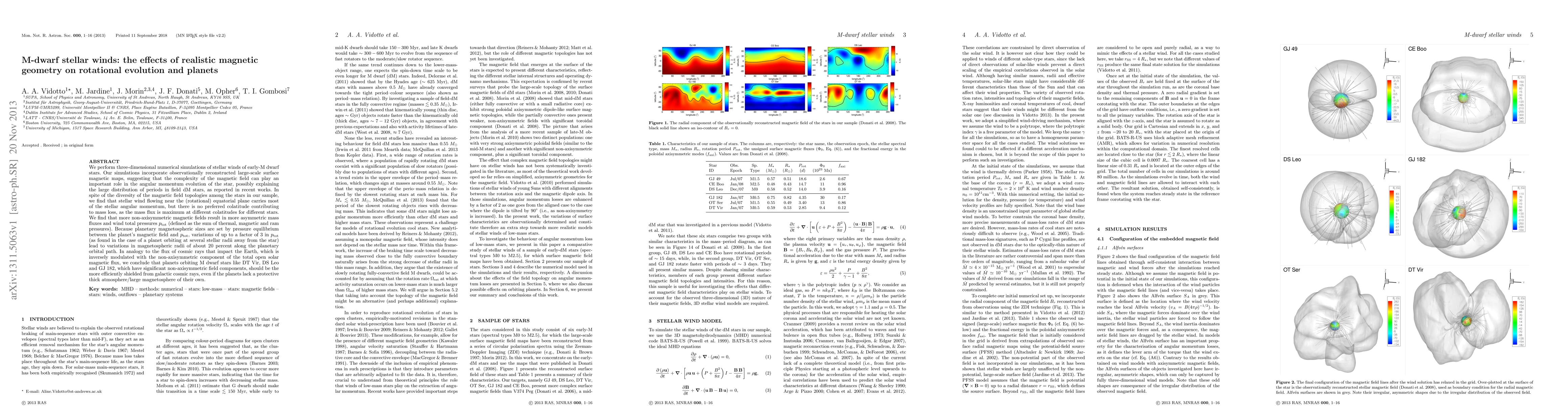 We perform three-dimensional numerical simulations of stellar winds of early-M dwarf stars. Our simulations incorporate observationally reconstructed large-scale surface magnetic maps, suggesting that the complexity of the magnetic field can play an important role in the angular momentum evolution of the star, possibly explaining the large distribution of periods in field dM stars, as reported in recent works. In spite of the diversity of the magnetic field topologies among the stars in our sample, we find that stellar wind flowing near the (rotational) equatorial plane carries most of the stellar angular momentum, but there is no preferred colatitude contributing to mass loss, as the mass flux is maximum at different colatitudes for different stars. We find that more non-axisymmetric magnetic fields result in more asymmetric mass fluxes and wind total pressures $p_{\rm tot}$ (defined as the sum of thermal, magnetic and ram pressures). Because planetary magnetospheric sizes are set by pressure equilibrium between the planet's magnetic field and $p_{\rm tot}$, variations of up to a factor of $3$ in $p_{\rm tot}$ (as found in the case of a planet orbiting at several stellar radii away from the star) lead to variations in magnetospheric radii of about 20 percent along the planetary orbital path. In analogy to the flux of cosmic rays that impact the Earth, which is inversely modulated with the non-axisymmetric component of the total open solar magnetic flux, we conclude that planets orbiting M dwarf stars like DT~Vir, DS~Leo and GJ~182, which have significant non-axisymmetric field components, should be the more efficiently shielded from galactic cosmic rays, even if the planets lack a protective thick atmosphere/large magnetosphere of their own.