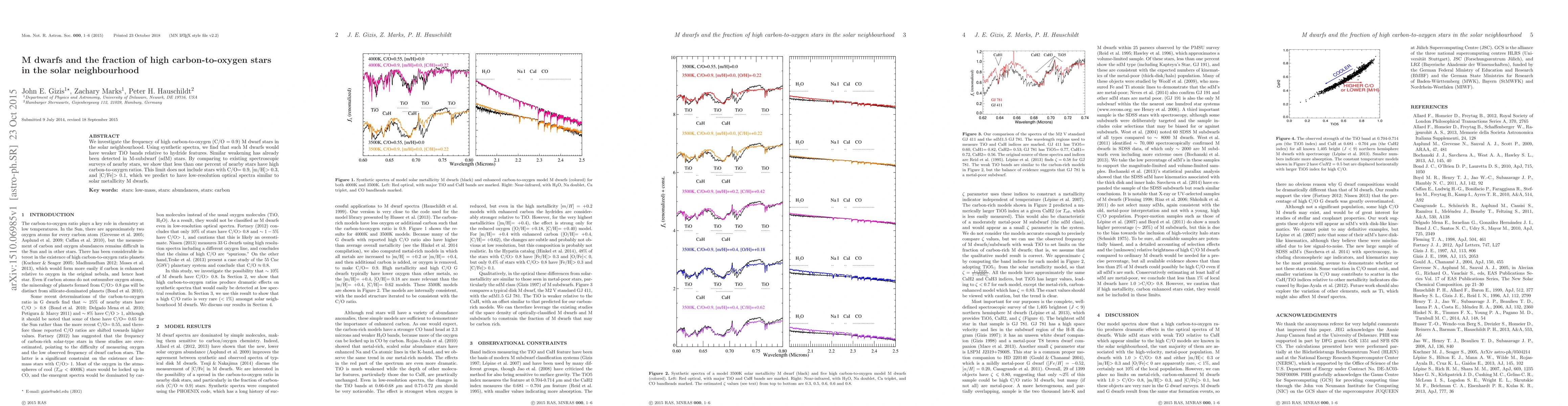 This study finds that less than one percent of nearby M dwarfs exhibit high carbon-to-oxygen ratios (C/O $= 0.9$). These stars show weaker TiO bands compared to hydride features, similar to M-subdwarf stars, and are predicted to have low-resolution optical spectra akin to solar metallicity M dwarfs.