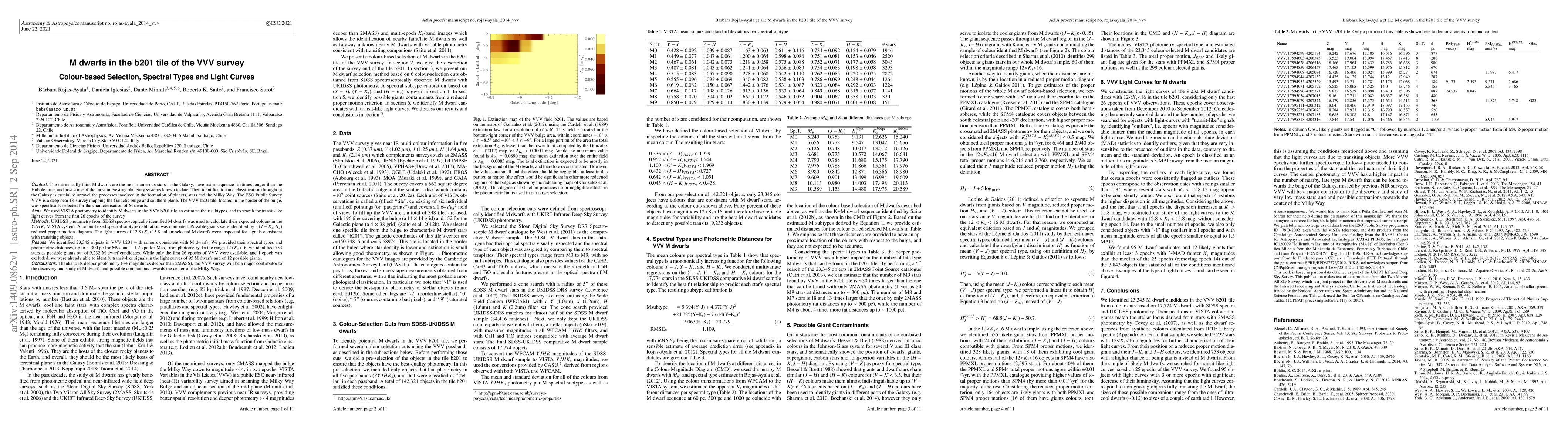 A survey of M dwarf stars in the VVV b201 tile identified 23,345 objects with colors consistent with M dwarfs, including spectral types and photometric distances. The study also found transit-like signals in 95 M dwarfs and possible giants, contributing to the discovery and study of these faint stars.