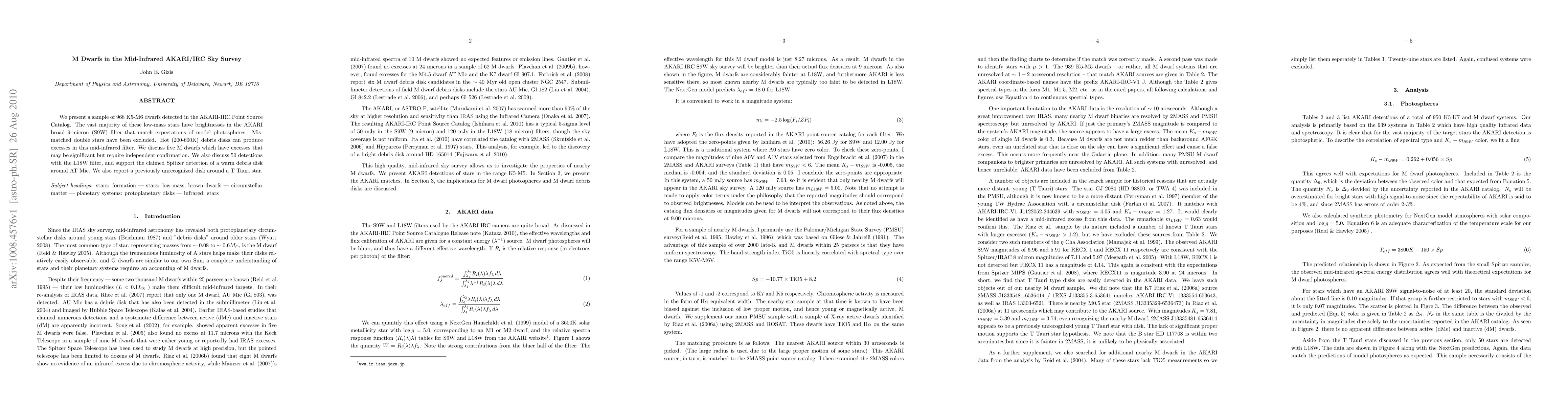 We present a sample of 968 K5-M6 dwarfs detected in the AKARI-IRC Point Source Catalog. The vast majority of these low-mass stars have brightnesses in the AKARI broad 9-micron (S9W) filter that match expectations of model photospheres. Mismatched double stars have been excluded. Hot (200-600K) debris disks can produce excesses in this mid-infrared filter. We discuss five M dwarfs which have excesses that may be significant but require independent confirmation. We also discuss 50 detections with the L18W filter, and support the claimed Spitzer detection of a warm debris disk around AT Mic. We also report a previously unrecognized disk around a T Tauri star.