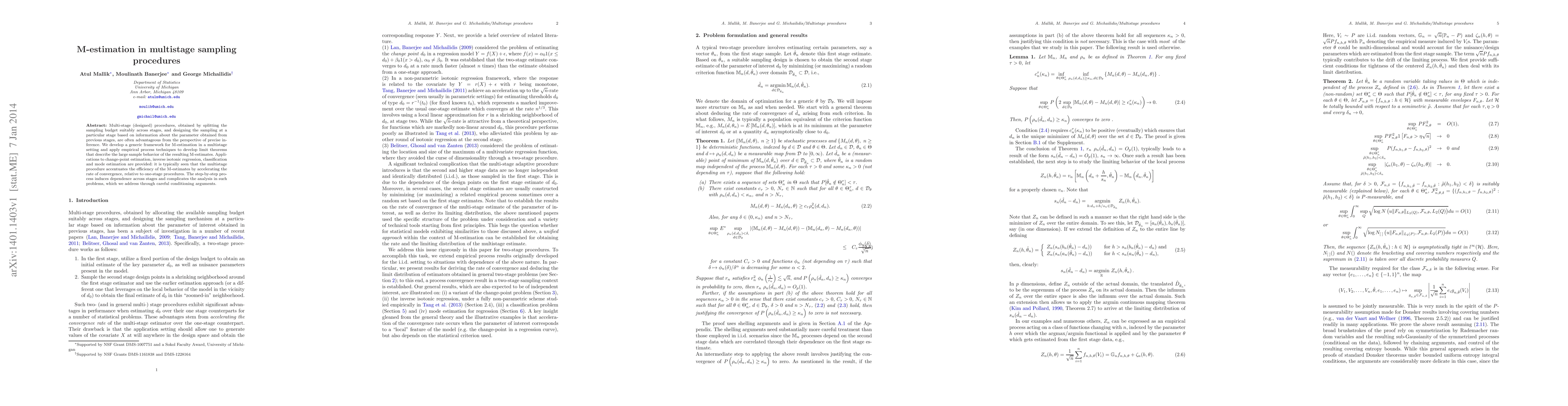 This paper develops a framework for M-estimation in multistage sampling procedures, showing that these methods can accelerate the convergence rate and improve efficiency compared to one-stage procedures. It uses empirical process techniques to derive limit theorems and addresses the induced dependence across stages through conditioning arguments.