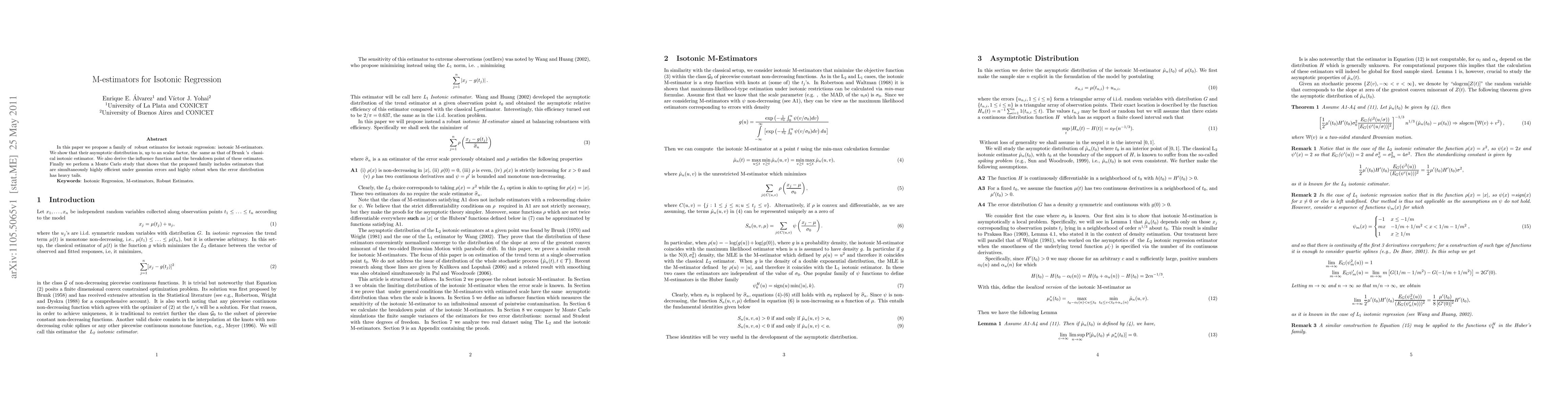 This paper introduces isotonic M-estimators for robust isotonic regression, demonstrating their asymptotic equivalence to Brunk's classical estimator and presenting their influence function and breakdown point. The study concludes that these estimators offer high efficiency under Gaussian errors and robust performance with heavy-tailed distributions.