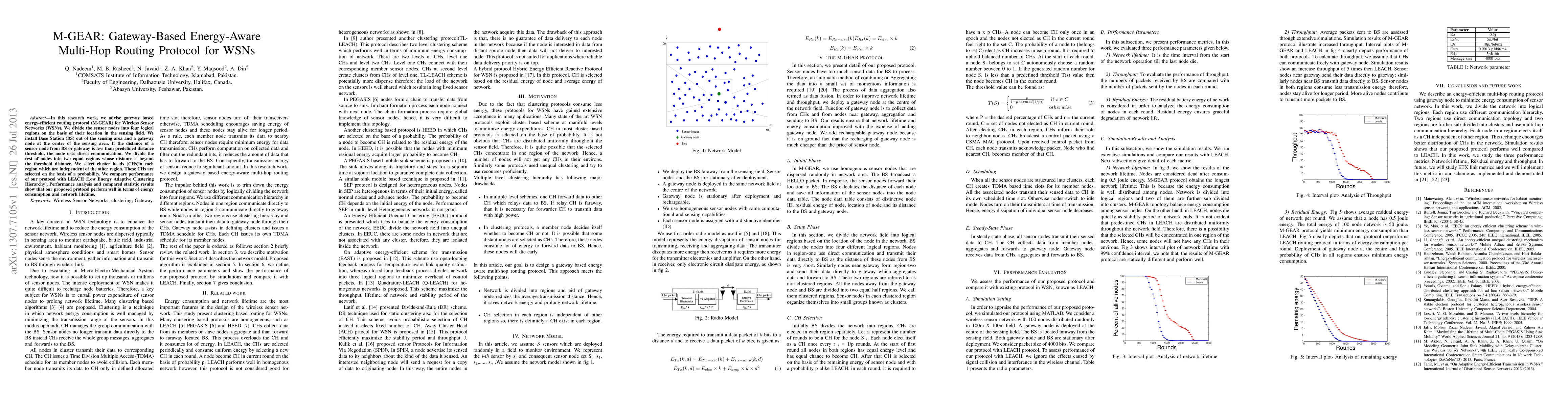 The M-GEAR protocol introduces a gateway-based energy-efficient routing method for Wireless Sensor Networks, dividing nodes into regions and selecting cluster heads based on probability, which outperforms LEACH in terms of energy consumption and network lifetime.