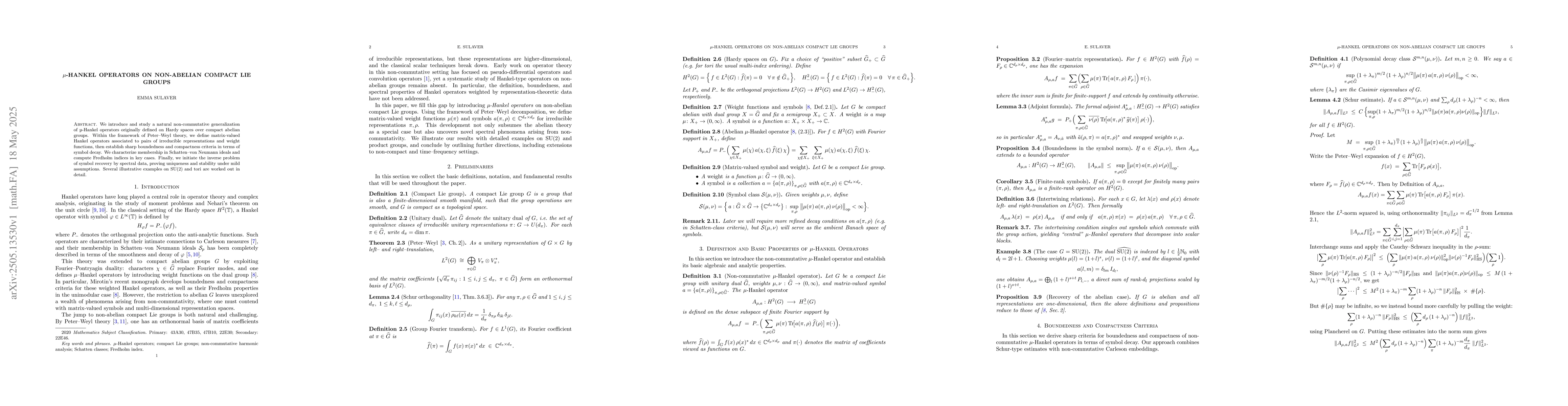 The research introduces and studies μ-Hankel operators on non-Abelian compact Lie groups, generalizing the concept from Hardy spaces over compact abelian groups using Peter-Weyl theory. It establishes boundedness and compactness criteria, characterizes membership in Schatten-von Neumann ideals, computes Fredholm indices, and initiates the inverse problem of symbol recovery.