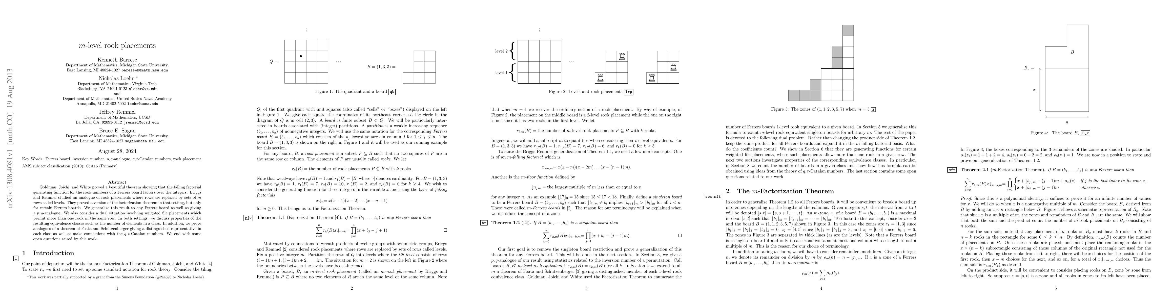 Goldman, Joichi, and White proved a beautiful theorem showing that the falling factorial generating function for the rook numbers of a Ferrers board factors over the integers. Briggs and Remmel studied an analogue of rook placements where rows are replaced by sets of $m$ rows called levels. They proved a version of the factorization theorem in that setting, but only for certain Ferrers boards. We generalize this result to any Ferrers board as well as giving a p,q-analogue. We also consider a dual situation involving weighted file placements which permit more than one rook in the same row. In both settings, we discuss properties of the resulting equivalence classes such as the number of elements in a class. In addition, we prove analogues of a theorem of Foata and Sch\"utzenberger giving a distinguished representative in each class as well as make connections with the q,t-Catalan numbers. We end with some open questions raised by this work.