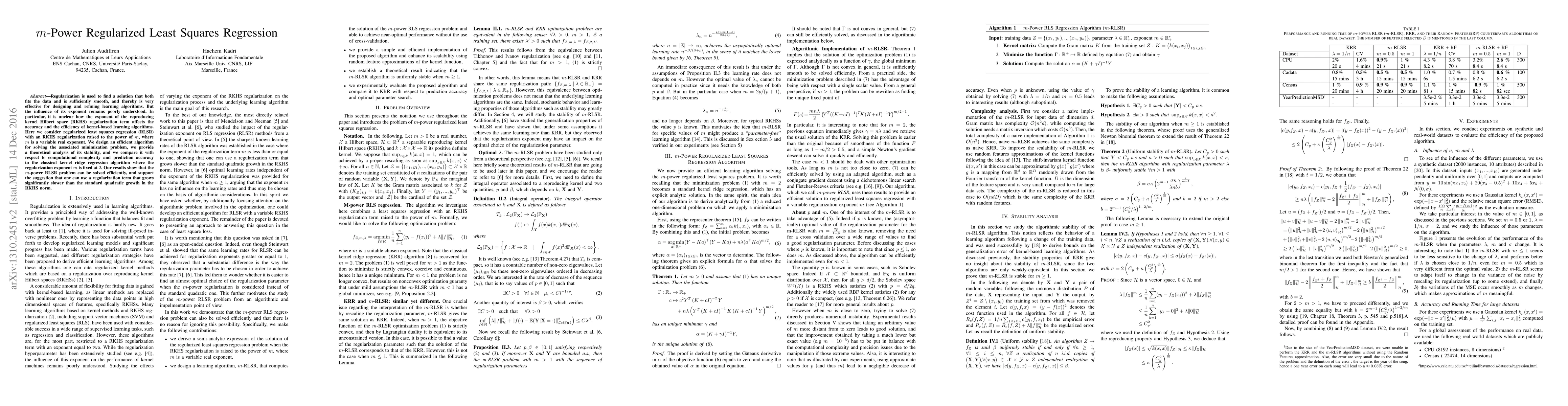 Regularization is used to find a solution that both fits the data and is sufficiently smooth, and thereby is very effective for designing and refining learning algorithms. But the influence of its exponent remains poorly understood. In particular, it is unclear how the exponent of the reproducing kernel Hilbert space~(RKHS) regularization term affects the accuracy and the efficiency of kernel-based learning algorithms. Here we consider regularized least squares regression (RLSR) with an RKHS regularization raised to the power of m, where m is a variable real exponent. We design an efficient algorithm for solving the associated minimization problem, we provide a theoretical analysis of its stability, and we compare its advantage with respect to computational complexity, speed of convergence and prediction accuracy to the classical kernel ridge regression algorithm where the regularization exponent m is fixed at 2. Our results show that the m-power RLSR problem can be solved efficiently, and support the suggestion that one can use a regularization term that grows significantly slower than the standard quadratic growth in the RKHS norm.