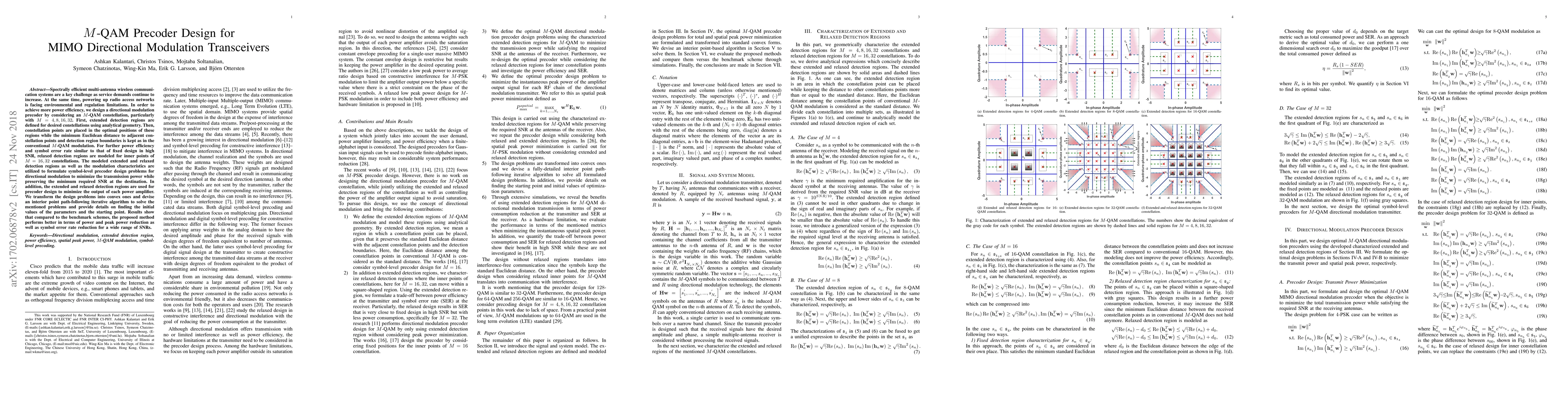 This paper proposes an $M$-QAM precoder design for MIMO directional modulation transceivers to enhance power efficiency. It defines extended and relaxed detection regions for $M=4,8,16,32$ constellations, optimizing symbol placement and formulating convex precoder design problems to minimize transmission power and peak power while maintaining required SNR and symbol error rate. Results indicate superior performance over benchmark schemes in power and peak power reduction.