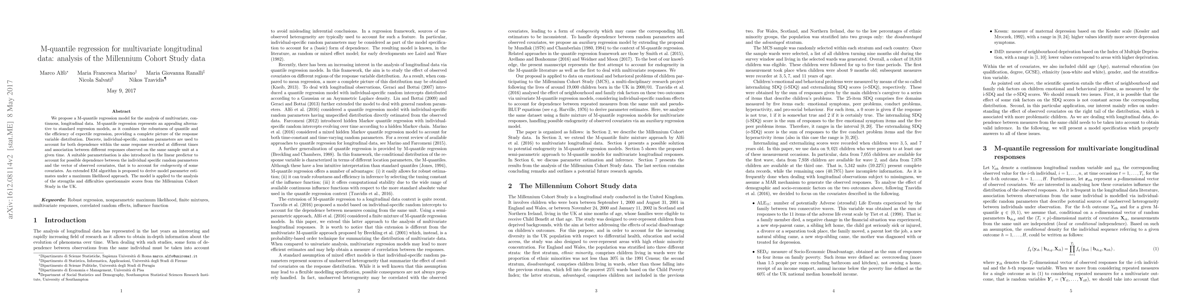 This paper proposes an M-quantile regression model for analyzing multivariate longitudinal data, offering a robust alternative to standard regression by combining quantile and expectile regression benefits. The model is applied to Millennium Cohort Study data to assess questionnaire scores, addressing endogeneity and dependencies within and between responses.