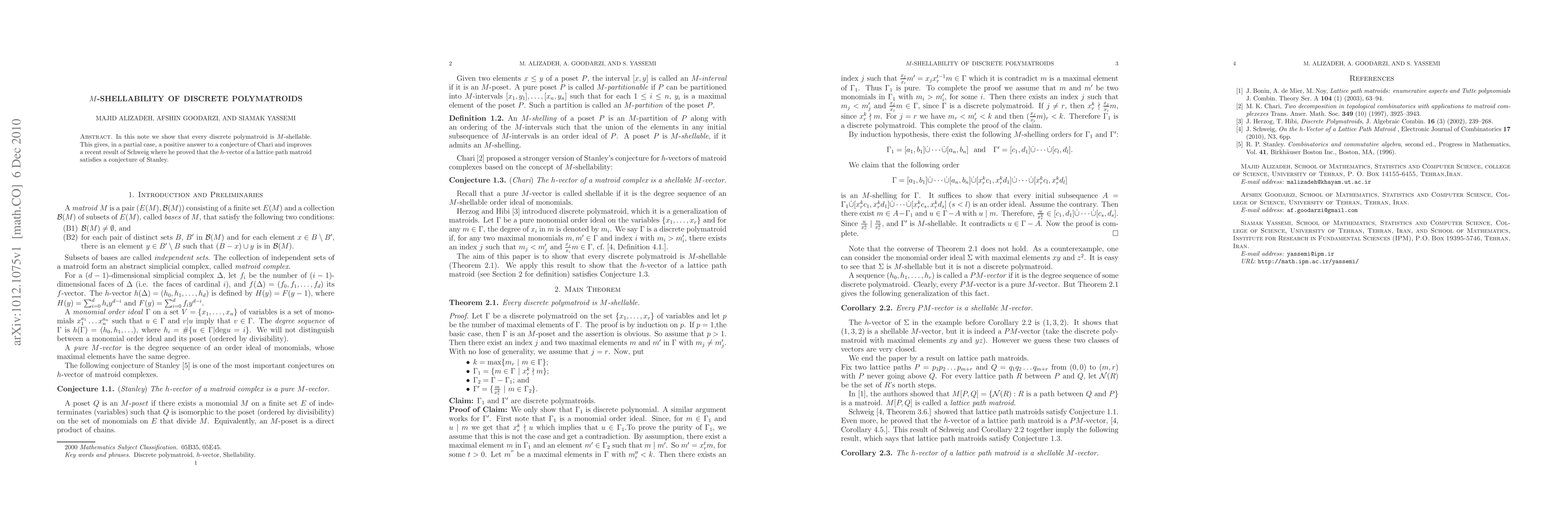 In this note we show that every discrete polymatroid is $M$-shellable. This gives, in a partial case, a positive answer to a conjecture of Chari and improves a recent result of Schweig where he proved that the $h$-vector of a lattice path matroid satisfies a conjecture of Stanley.
