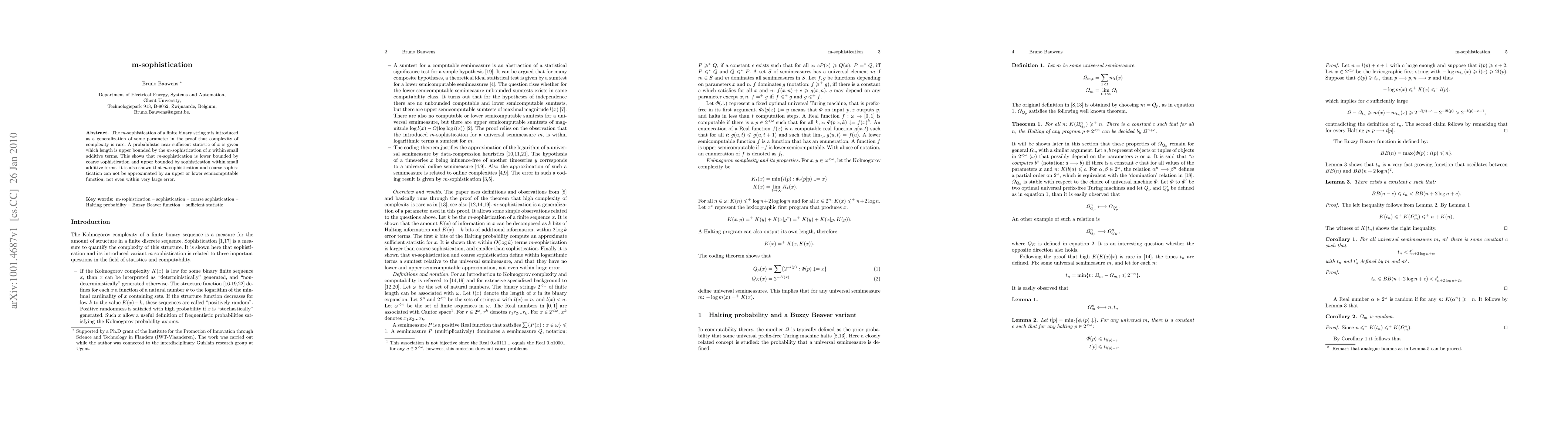 The m-sophistication of a finite binary string x is introduced as a generalization of some parameter in the proof that complexity of complexity is rare. A probabilistic near sufficient statistic of x is given which length is upper bounded by the m-sophistication of x within small additive terms. This shows that m-sophistication is lower bounded by coarse sophistication and upper bounded by sophistication within small additive terms. It is also shown that m-sophistication and coarse sophistication can not be approximated by an upper or lower semicomputable function, not even within very large error.