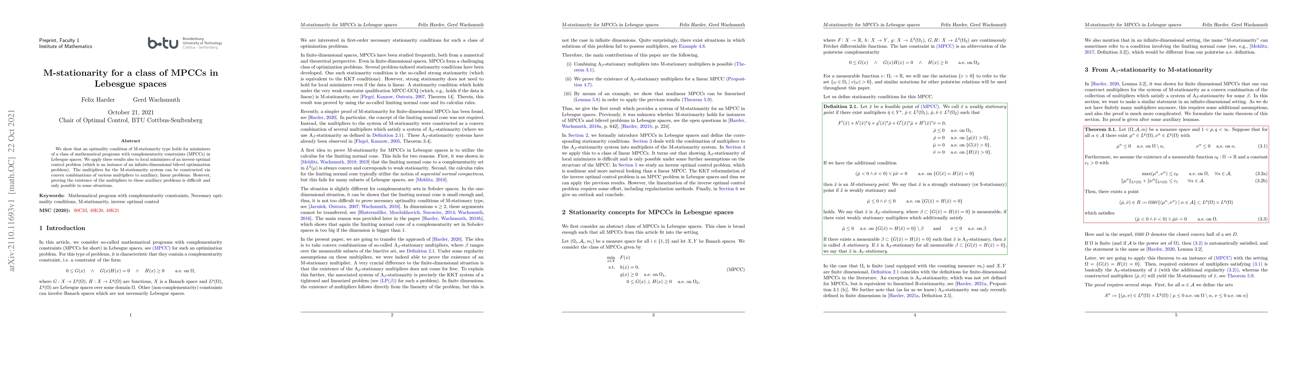 This paper establishes M-stationarity optimality conditions for a class of mathematical programs with complementarity constraints (MPCCs) in Lebesgue spaces. It also applies these results to local minimizers of an inverse optimal control problem, though proving the existence of multipliers for auxiliary linear problems remains challenging.