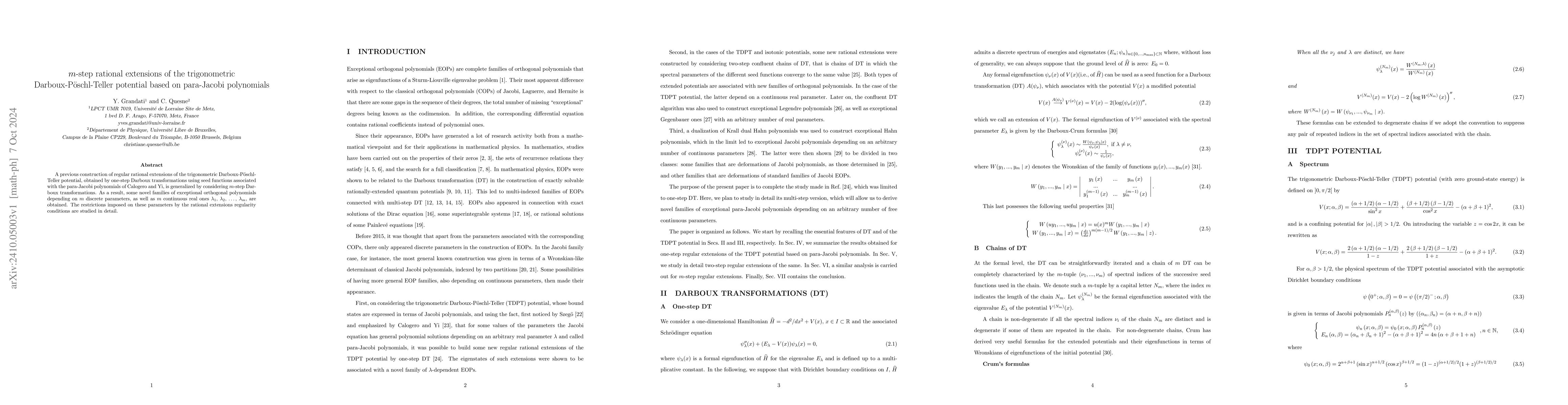 A previous construction of regular rational extensions of the trigonometric Darboux-P\"oschl-Teller potential, obtained by one-step Darboux transformations using seed functions associated with the para-Jacobi polynomials of Calogero and Yi, is generalized by considering $m$-step Darboux transformations. As a result, some novel families of exceptional orthogonal polynomials depending on $m$ discrete parameters, as well as $m$ continuous real ones $\lambda_1$, $\lambda_2$, \ldots, $\lambda_m$, are obtained. The restrictions imposed on these parameters by the rational extensions regularity conditions are studied in detail.