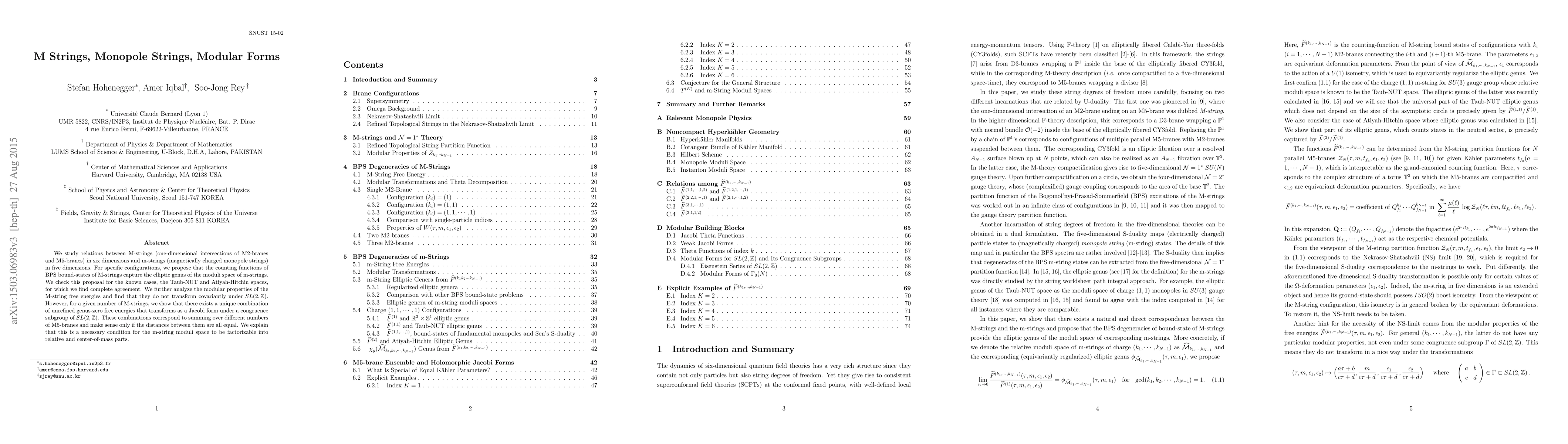 This paper explores connections between M-strings in six dimensions and m-strings in five dimensions, proposing that M-string counting functions match the elliptic genus of m-string moduli spaces. It also investigates modular properties of M-string free energies, revealing unique combinations that transform as Jacobi forms under specific SL(2,Z) subgroups.