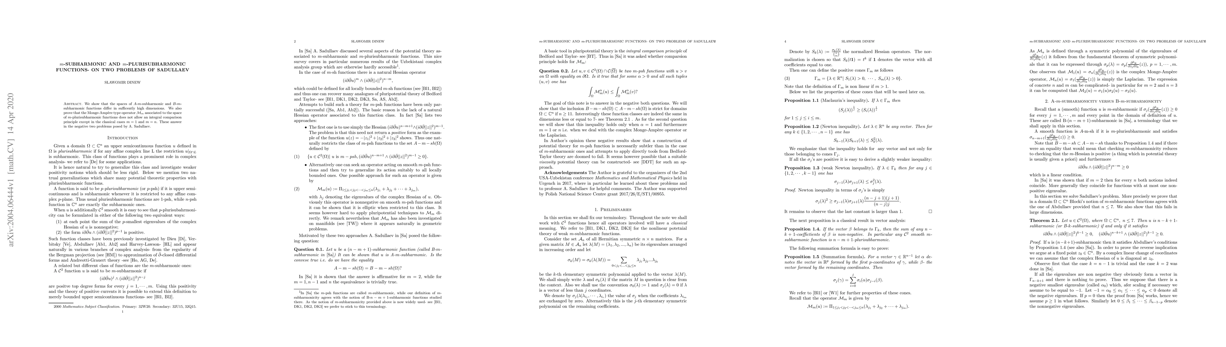 We show that the spaces of $A$-$m$-subharmonic and $B$-$m$-subharmonic functions differ in sufficently high dimensions. We also prove that the Monge-Amp\`ere type operator $\mathcal M_m$ associated to the space of $m$-plurisubharmonic functions does not allow an integral comparison principle except in the classical cases $m=1$ and $m=n$. These answer in the negative two problems posed by A. Sadullaev.