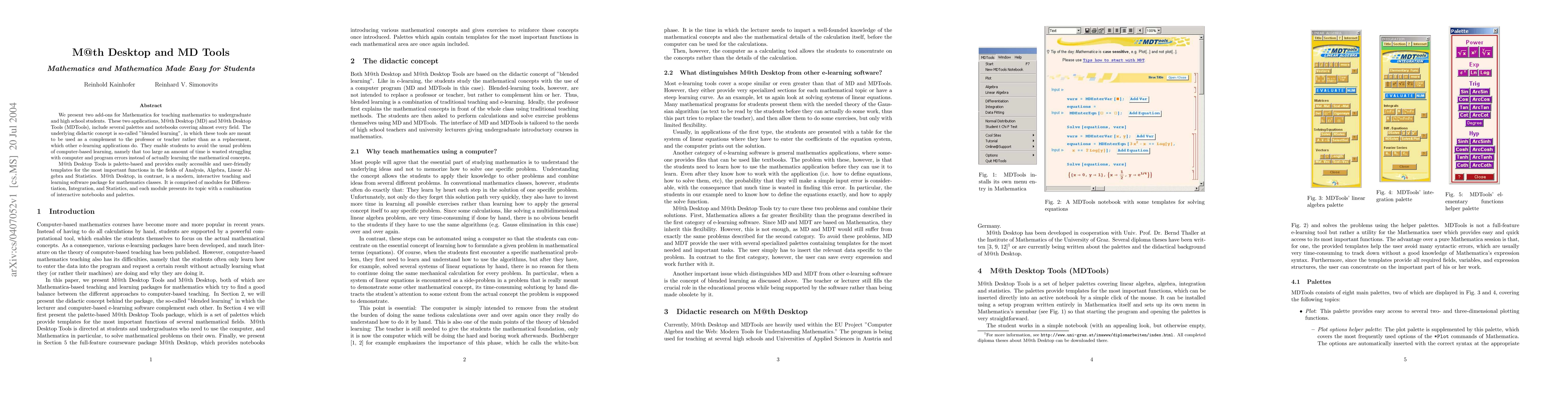 We present two add-ons for Mathematica for teaching mathematics to undergraduate and high school students. These two applications, M@th Desktop (MD) and M@th Desktop Tools (MDTools), include several palettes and notebooks covering almost every field. The underlying didactic concept is so-called "blended learning", in which these tools are meant to be used as a complement to the professor or teacher rather than as a replacement, which other e-learning applications do. They enable students to avoid the usual problem of computer-based learning, namely that too large an amount of time is wasted struggling with computer and program errors instead of actually learning the mathematical concepts. M@th Desktop Tools is palette-based and provides easily accessible and user-friendly templates for the most important functions in the fields of Analysis, Algebra, Linear Algebra and Statistics. M@th Desktop, in contrast, is a modern, interactive teaching and learning software package for mathematics classes. It is comprised of modules for Differentiation, Integration, and Statistics, and each module presents its topic with a combination of interactive notebooks and palettes. Both packages can be obtained from Deltasoft's homepage at http://www.deltasoft.at/ .