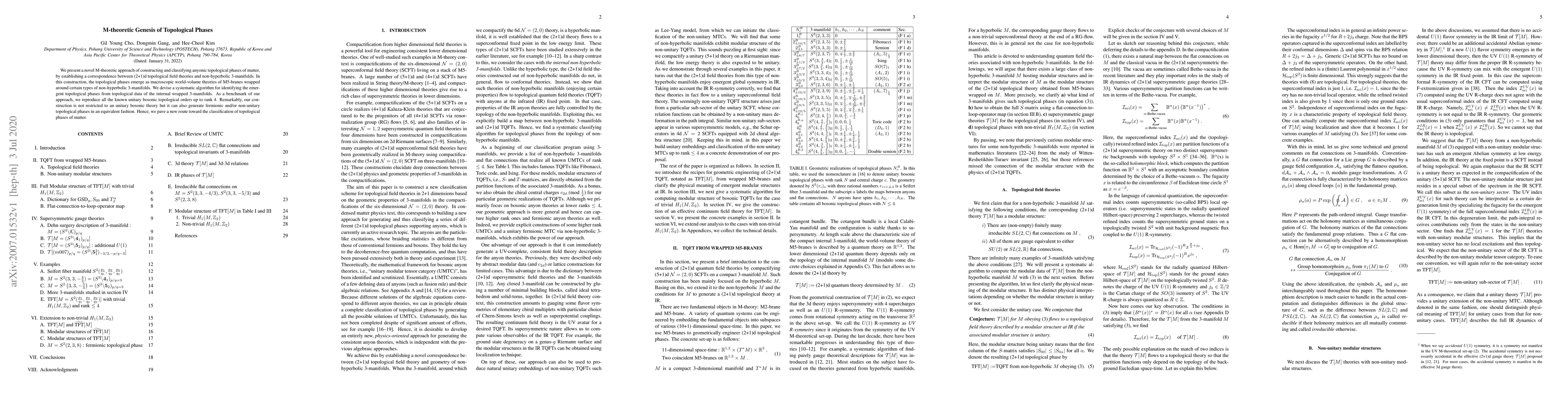 This paper introduces a new M-theoretic framework to construct and classify anyonic topological phases of matter by linking (2+1)d topological field theories to non-hyperbolic 3-manifolds. The approach reveals how topological phases arise from M5-branes wrapped around these manifolds, providing a systematic method for identifying these phases from topological data.