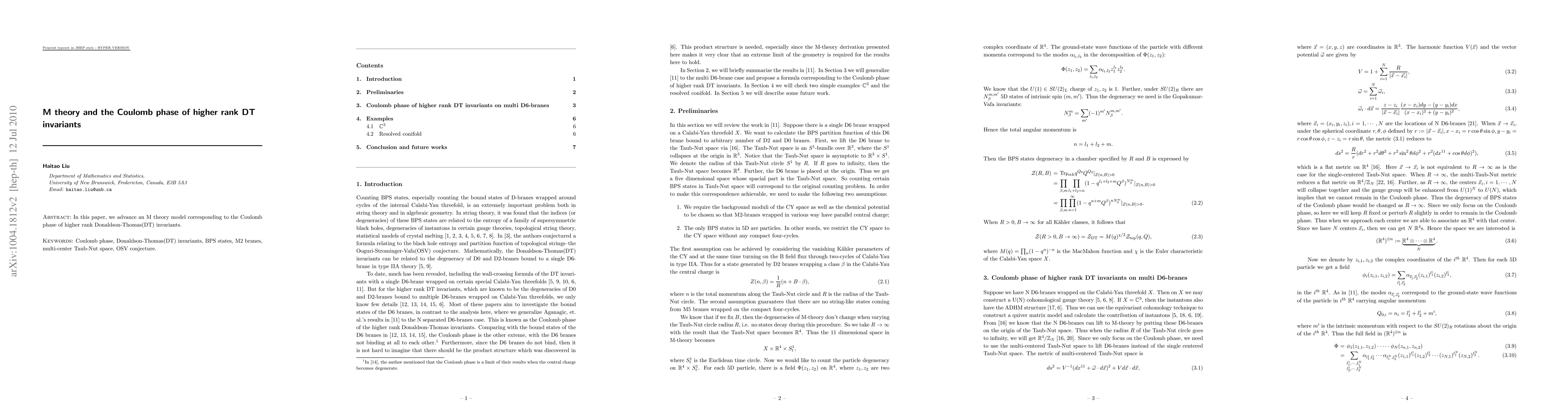 This research develops an M theory model that describes the Coulomb phase of higher rank Donaldson-Thomas invariants, contributing to our understanding of their underlying structure. The study provides a framework for analyzing these invariants within the context of M theory.