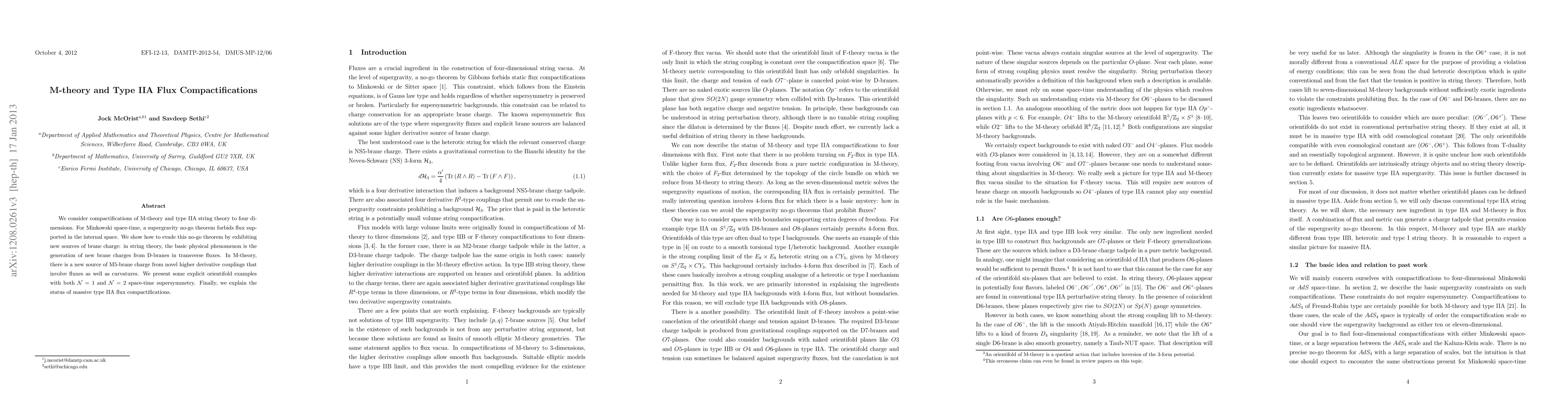 We consider compactifications of M-theory and type IIA string theory to four dimensions. For Minkowski space-time, a supergravity no-go theorem forbids flux supported in the internal space. We show how to evade this no-go theorem by exhibiting new sources of brane charge: in string theory, the basic physical phenomenon is the generation of new brane charges from D-branes in transverse fluxes. In M-theory, there is a new source of M5-brane charge from novel higher derivative couplings that involve fluxes as well as curvatures. We present some explicit orientifold examples with both N=1 and N=2 space-time supersymmetry. Finally, we explain the status of massive type IIA flux compactifications.