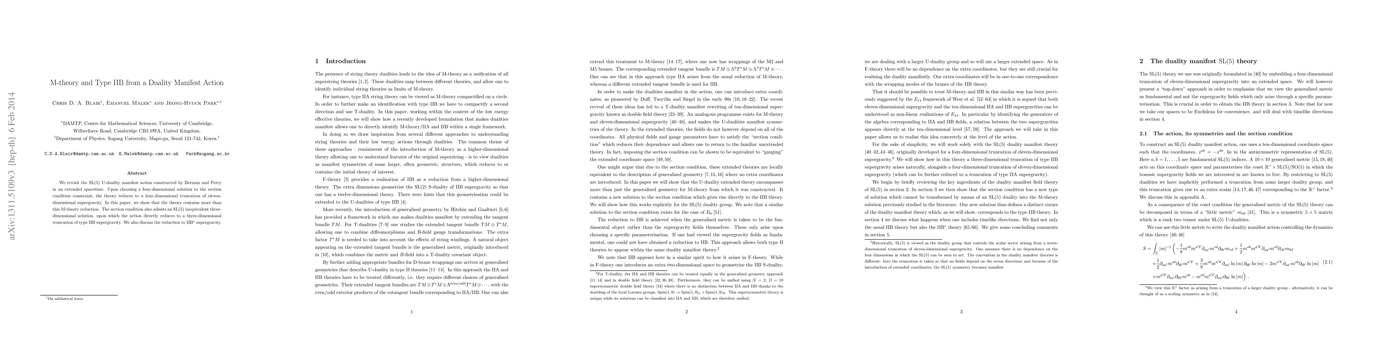 We revisit the SL(5) U-duality manifest action constructed by Berman and Perry in an extended spacetime. Upon choosing a four-dimensional solution to the section condition constraint, the theory reduces to a four-dimensional truncation of eleven-dimensional supergravity. In this paper, we show that the theory contains more than this M-theory reduction. The section condition also admits an SL(5) inequivalent three-dimensional solution, upon which the action directly reduces to a three-dimensional truncation of type IIB supergravity. We also discuss the reduction to IIB$^*$ supergravity.