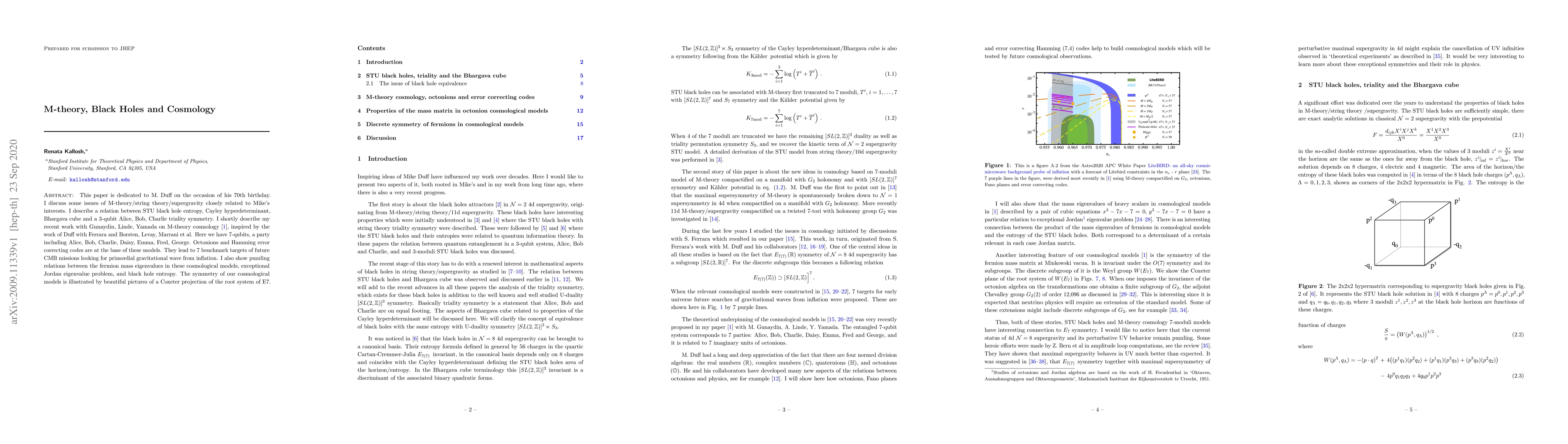 This paper explores the connections between M-theory, black hole entropy, and cosmology, highlighting a relation between black hole entropy, Cayley hyperdeterminant, and triality symmetries, and presenting new cosmological models based on octonions and Hamming codes, with implications for future CMB missions.