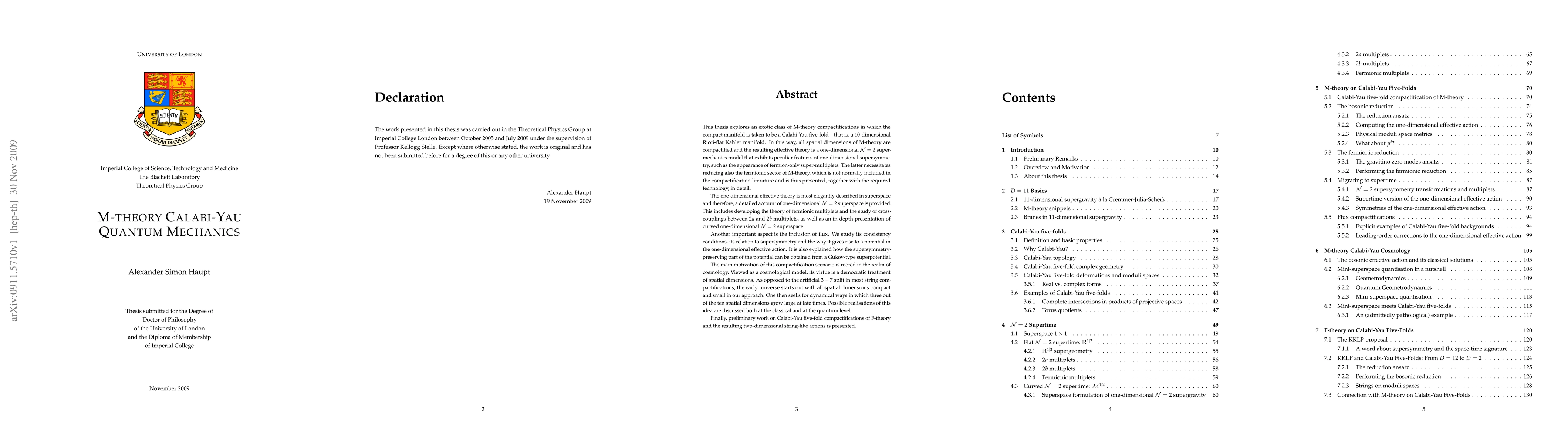 This thesis explores an exotic class of M-theory compactifications in which the compact manifold is taken to be a Calabi-Yau five-fold. The resulting effective theory is a one-dimensional N=2 super-mechanics model that exhibits peculiar features of one-dimensional supersymmetry, such as the appearance of fermion-only super-multiplets. The latter necessitates reducing also the fermionic sector of M-theory, which is not normally included in the compactification literature and is thus presented, together with the required technology, in detail. The one-dimensional effective theory is most elegantly described in superspace and therefore, a detailed account of one-dimensional flat and curved N=2 superspace is provided. This includes developing the theory of fermionic multiplets and the study of cross-couplings between 2a and 2b multiplets. Another important aspect is the inclusion of flux. We study its consistency conditions, its relation to supersymmetry and the way it gives rise to a potential in the one-dimensional effective action. It is also explained how the supersymmetry-preserving part of the potential can be obtained from a Gukov-type superpotential. The main motivation of this compactification scenario is rooted in the realm of cosmology. Its virtue is a democratic treatment of spatial dimensions. As opposed to the artificial 3+7 split in most string compactifications, the early universe starts out with all spatial dimensions compact and small in our approach. One then seeks for dynamical ways in which three dimensions grow large at late times. Possible realisations of this idea are discussed both at the classical and at the quantum level. Finally, preliminary work on Calabi-Yau five-fold compactifications of F-theory and the resulting two-dimensional string-like actions is presented.