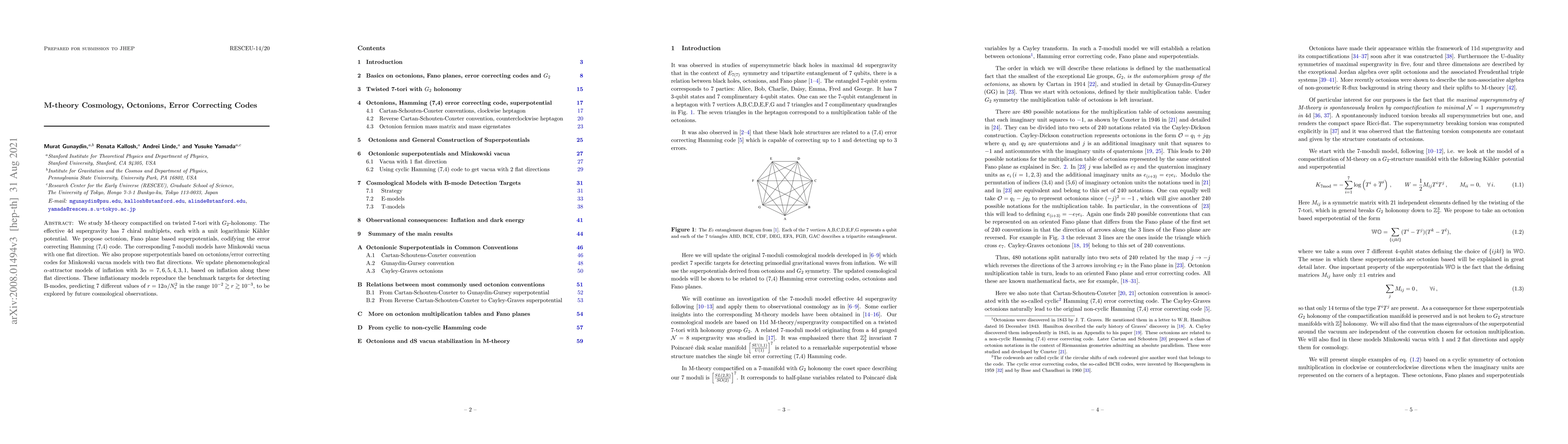 We study M-theory compactified on twisted 7-tori with $G_2$-holonomy. The effective 4d supergravity has 7 chiral multiplets, each with a unit logarithmic K\"ahler potential. We propose octonion, Fano plane based superpotentials, codifying the error correcting Hamming (7,4) code. The corresponding 7-moduli models have Minkowski vacua with one flat direction. We also propose superpotentials based on octonions/error correcting codes for Minkowski vacua models with two flat directions. We update phenomenological $\alpha$-attractor models of inflation with $3\alpha=7,6,5,4,3,1$, based on inflation along these flat directions. These inflationary models reproduce the benchmark targets for detecting B-modes, predicting 7 different values of $r = 12\alpha/N_{e}^{2}$ in the range $10^{-2}\gtrsim r \gtrsim 10^{-3}$, to be explored by future cosmological observations.
