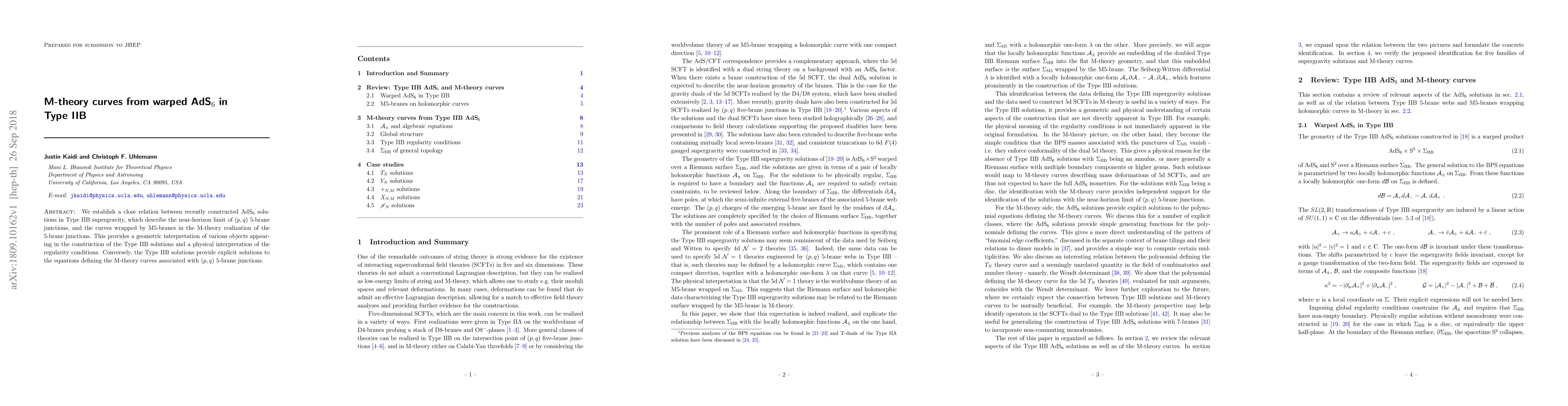 This paper establishes a connection between Type IIB AdS$_6$ solutions and M5-branes wrapped around M-theory curves, offering a geometric interpretation of Type IIB constructions and a physical interpretation of regularity conditions. The Type IIB solutions also provide explicit solutions for the equations defining M-theory curves associated with $(p,q)$ 5-brane junctions.