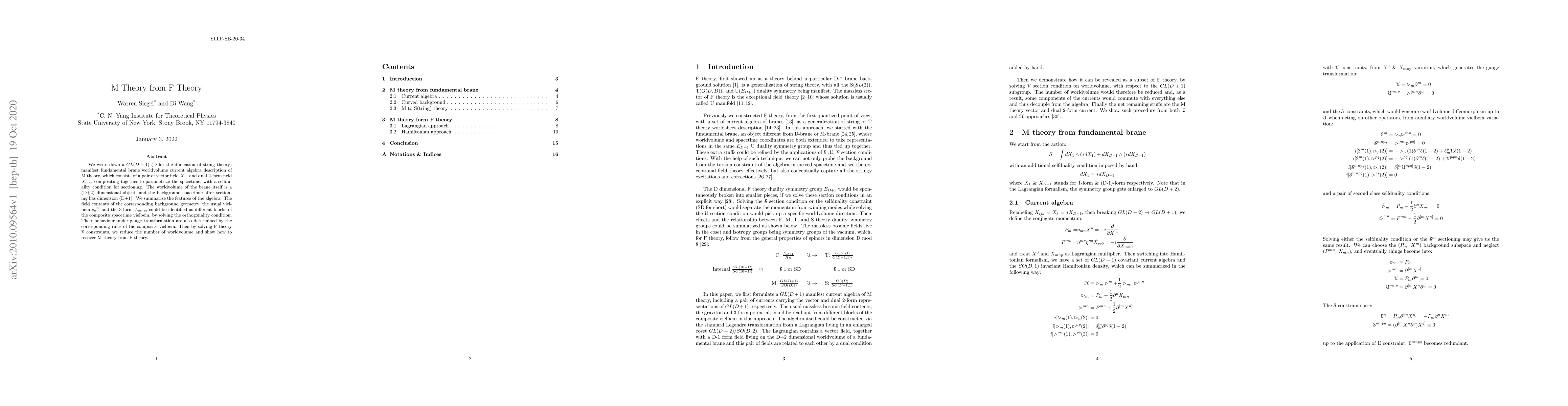 We write down a $GL(D+1)$ (D for the dimension of string theory) manifest fundamental brane worldvolume current algebra description of M theory, which consists of a pair of vector field $X^m$ and dual 2-form field $X_{mn}$, compositing together to parametrize the spacetime, with a selfduality condition for sectioning. The worldvolume of the brane itself is a (D+2) dimensional object, and the background spacetime after sectioning has dimension (D+1). We summarize the features of the algebra. The field contents of the corresponding background geometry, the usual vielbein $e_a{}^m$ and the 3-form $A_{mnp}$, could be identified as different blocks of the composite spacetime vielbein, by solving the orthogonality condition. Their behaviour under gauge transformation are also determined by the corresponding rules of the composite vielbein. Then by solving F theory $\mathcal{V}$ constraints, we reduce the number of worldvolume and show how to recover M theory from F theory.