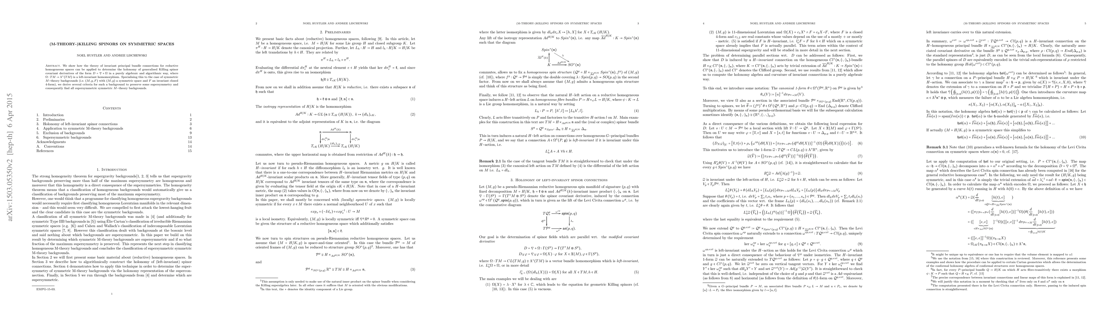 This paper applies the theory of invariant principal bundle connections to determine the holonomy of Killing spinor covariant derivatives in symmetric spaces, deriving criteria for supersymmetric symmetric M-theory backgrounds and identifying all such backgrounds. The method is purely algebraic and algorithmic.
