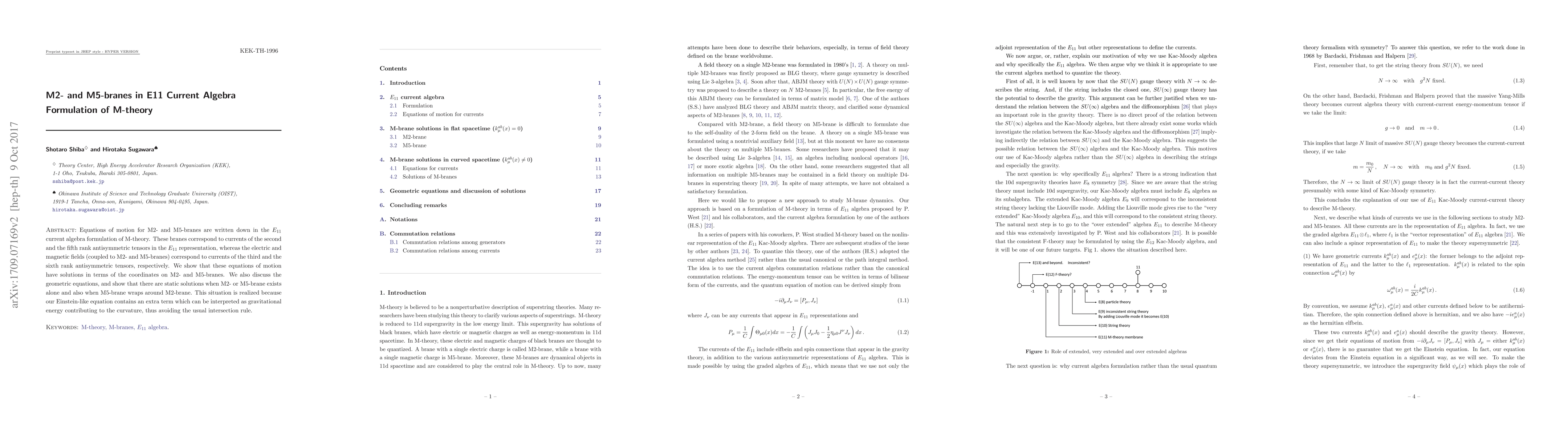 Equations of motion for M2- and M5-branes are written down in the $E_{11}$ current algebra formulation of M-theory. These branes correspond to currents of the second and the fifth rank antisymmetric tensors in the $E_{11}$ representation, whereas the electric and magnetic fields (coupled to M2- and M5-branes) correspond to currents of the third and the sixth rank antisymmetric tensors, respectively. We show that these equations of motion have solutions in terms of the coordinates on M2- and M5-branes. We also discuss the geometric equations, and show that there are static solutions when M2- or M5-brane exists alone and also when M5-brane wraps around M2-brane. This situation is realized because our Einstein-like equation contains an extra term which can be interpreted as gravitational energy contributing to the curvature, thus avoiding the usual intersection rule.