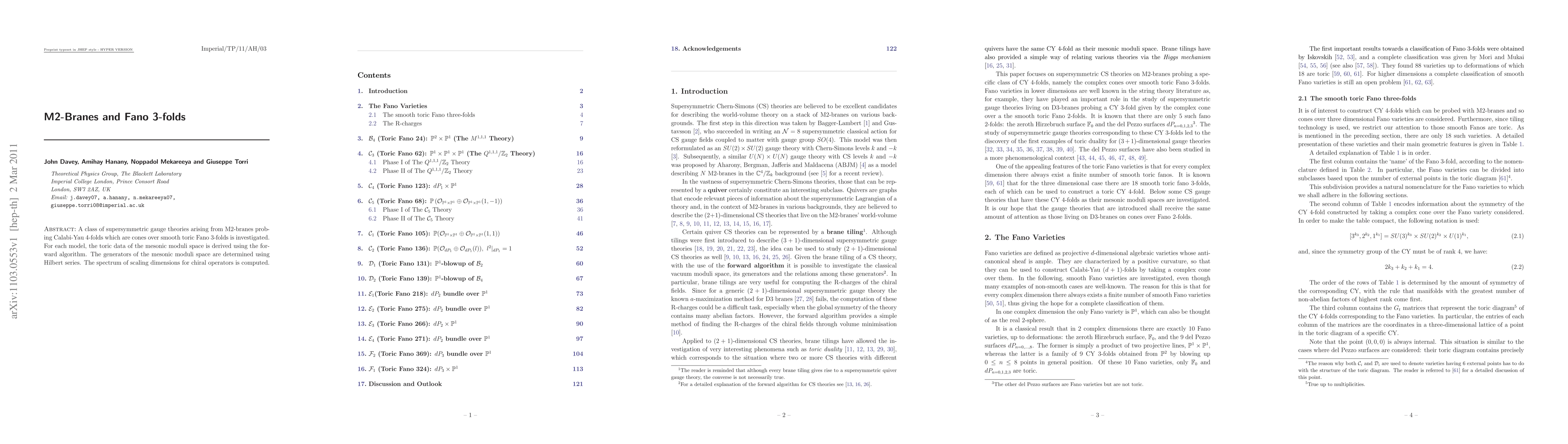 This research investigates supersymmetric gauge theories from M2-branes on Calabi-Yau 4-folds, derived from cones over toric Fano 3-folds, detailing the mesonic moduli space using the forward algorithm and Hilbert series, and computing the scaling dimensions of chiral operators.