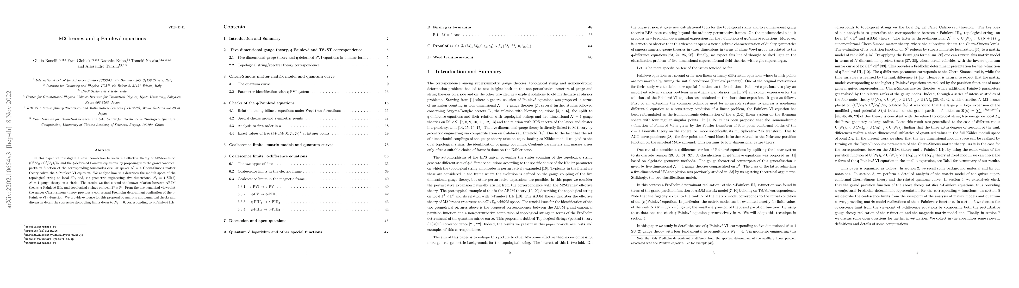 In this paper we investigate a novel connection between the effective theory of M2-branes on $(\mathbb{C}^2/\mathbb{Z}_2\times \mathbb{C}^2/\mathbb{Z}_2)/\mathbb{Z}_k$ and the $\mathfrak{q}$-deformed Painlev\'e equations, by proposing that the grand canonical partition function of the corresponding four-nodes circular quiver $\mathcal{N}=4$ Chern-Simons matter theory solves the $\mathfrak{q}$-Painlev\'e VI equation. We analyse how this describes the moduli space of the topological string on local $\text{dP}_5$ and, via geometric engineering, five dimensional $N_f=4$ $\text{SU}(2)$ $\mathcal{N}=1$ gauge theory on a circle. The results we find extend the known relation between ABJM theory, $\mathfrak{q}$-Painlev\'e $\text{III}_3$, and topological strings on local ${\mathbb P}^1\times{\mathbb P}^1$. From the mathematical viewpoint the quiver Chern-Simons theory provides a conjectural Fredholm determinant realisation of the $\mathfrak{q}$-Painlev\'e VI $\tau$-function. We provide evidence for this proposal by analytic and numerical checks and discuss in detail the successive decoupling limits down to $N_f=0$, corresponding to $\mathfrak{q}$-Painlev\'e$\,\,$III${}_3$.