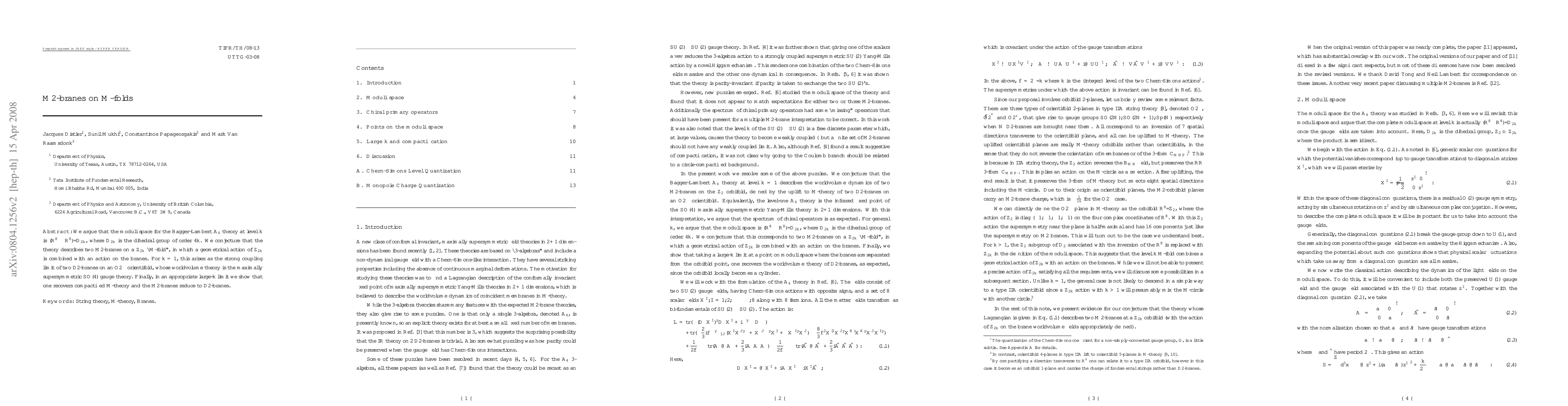 This paper proposes that the moduli space for the Bagger-Lambert A_4 theory corresponds to (R^8 \times R^8)/D_{2k}, with k=1 representing the strong coupling limit of two D2-branes on an O2^- orientifold. It conjectures the theory describes two M2-branes on a Z_{2k} "M-fold" in a combined geometrical and brane action framework, transitioning to compactified M-theory in a large-k limit.