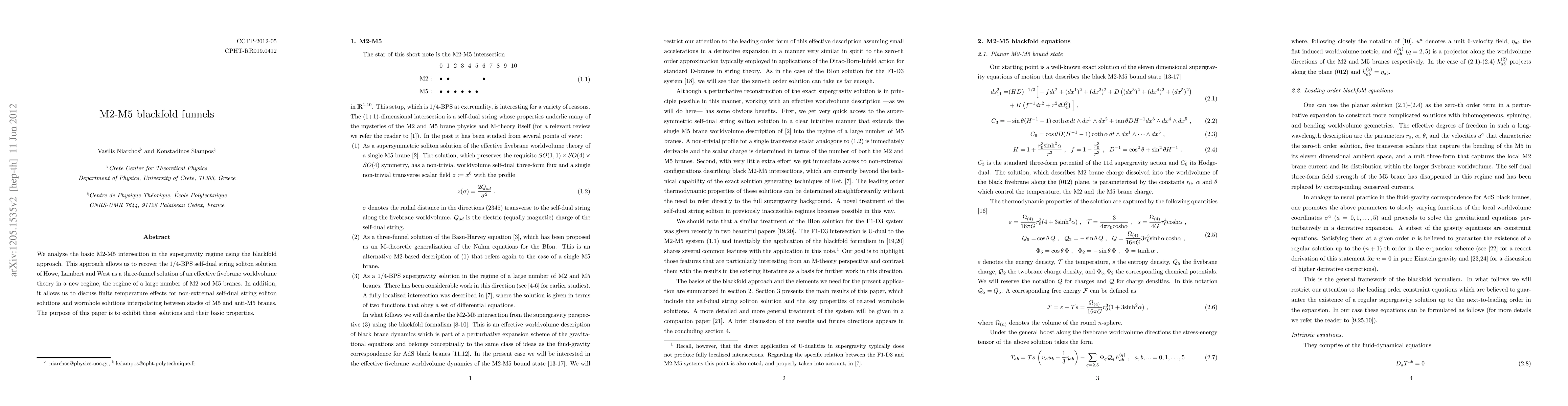 We analyze the basic M2-M5 intersection in the supergravity regime using the blackfold approach. This approach allows us to recover the 1/4-BPS self-dual string soliton solution of Howe, Lambert and West as a three-funnel solution of an effective fivebrane worldvolume theory in a new regime, the regime of a large number of M2 and M5 branes. In addition, it allows us to discuss finite temperature effects for non-extremal self-dual string soliton solutions and wormhole solutions interpolating between stacks of M5 and anti-M5 branes. The purpose of this paper is to exhibit these solutions and their basic properties.