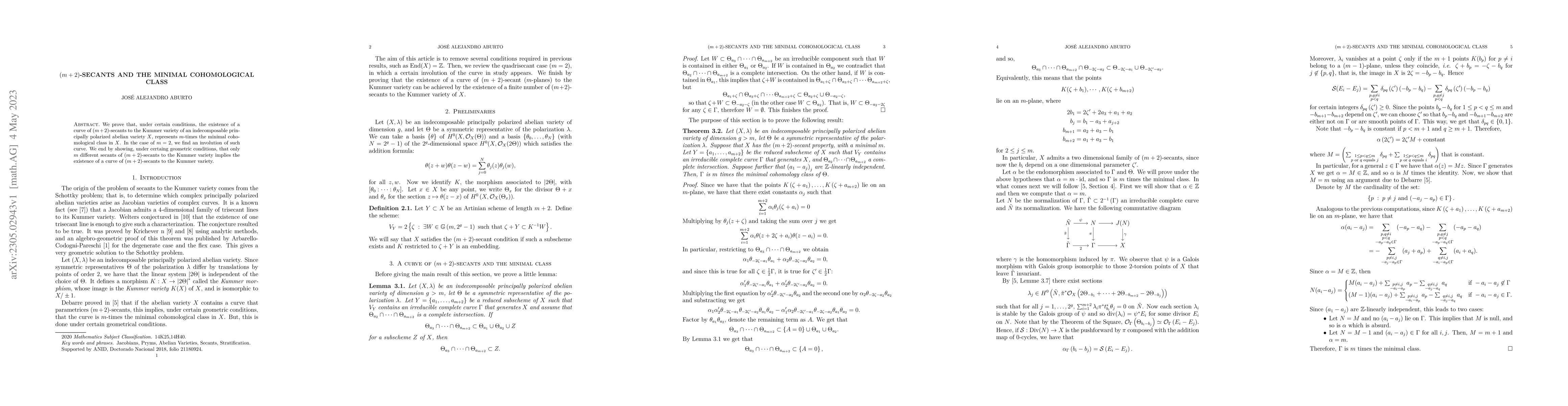 We prove that, under certain conditions, the existence of a curve of $(m+2)$-secants to the Kummer variety of an indecomposable principally polarized abelian variety $X$, represents $m$-times the minimal cohomological class in $X$. In the case of $m=2$, we find an involution of such curve. We end by showing, under certaing geometric conditions, that only \(m\) different secants of $(m+2)$-secants to the Kummer variety implies the existence of a curve of $(m+2)$-secants to the Kummer variety.