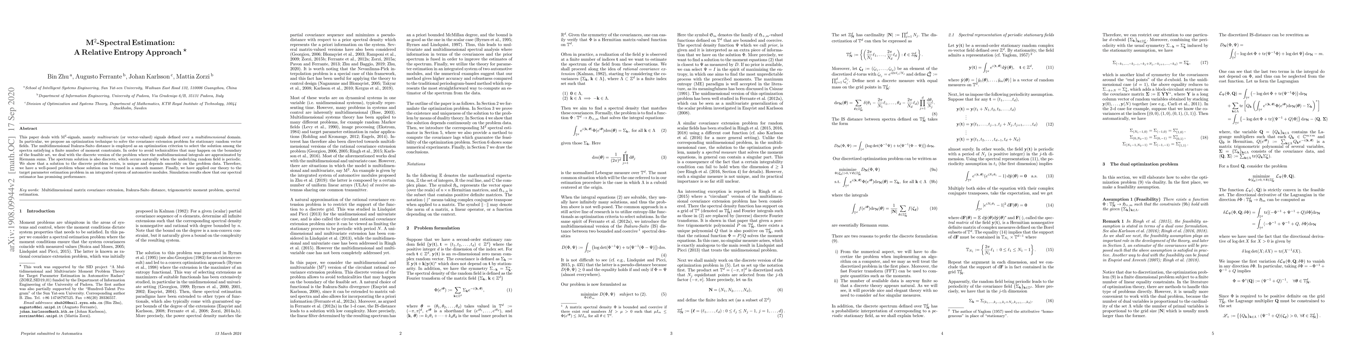 This paper deals with M$^2$-signals, namely multivariate (or vector-valued) signals defined over a multidimensional domain. In particular, we propose an optimization technique to solve the covariance extension problem for stationary random vector fields. The multidimensional Itakura-Saito distance is employed as an optimization criterion to select the solution among the spectra satisfying a finite number of moment constraints. In order to avoid technicalities that may happen on the boundary of the feasible set, we deal with the discrete version of the problem where the multidimensional integrals are approximated by Riemann sums. The spectrum solution is also discrete, which occurs naturally when the underlying random field is periodic. We show that a solution to the discrete problem exists, is unique and depends smoothly on the problem data. Therefore, we have a well-posed problem whose solution can be tuned in a smooth manner. Finally, we have applied our theory to the target parameter estimation problem in an integrated system of automotive modules. Simulation results show that our spectral estimator has promising performance.