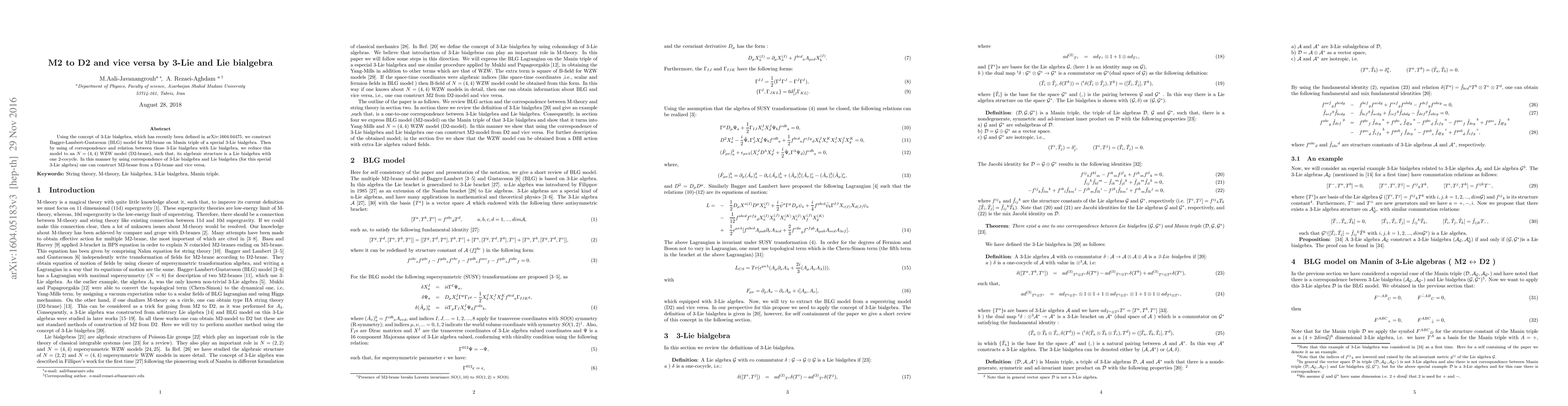 This paper constructs the Bagger-Lambert-Gustavson model for M2-brane using a 3-Lie bialgebra and reduces it to an $N=(4,4)$ WZW model for D2-brane via a Lie bialgebra correspondence, enabling the transformation between M2-brane and D2-brane structures.
