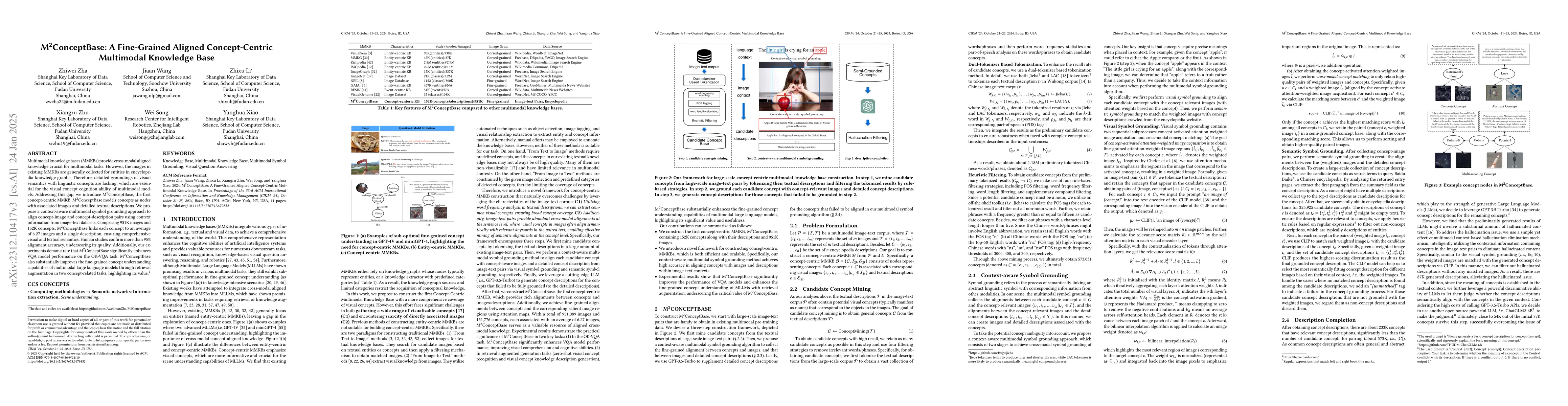 M2ConceptBase proposes a fine-grained multi-modal conceptual knowledge base to enhance large multi-modal models' cross-modal alignment by aligning concepts with detailed images and descriptions. Experiments on OK-VQA show improved performance, and a new benchmark demonstrates enhanced concept understanding.