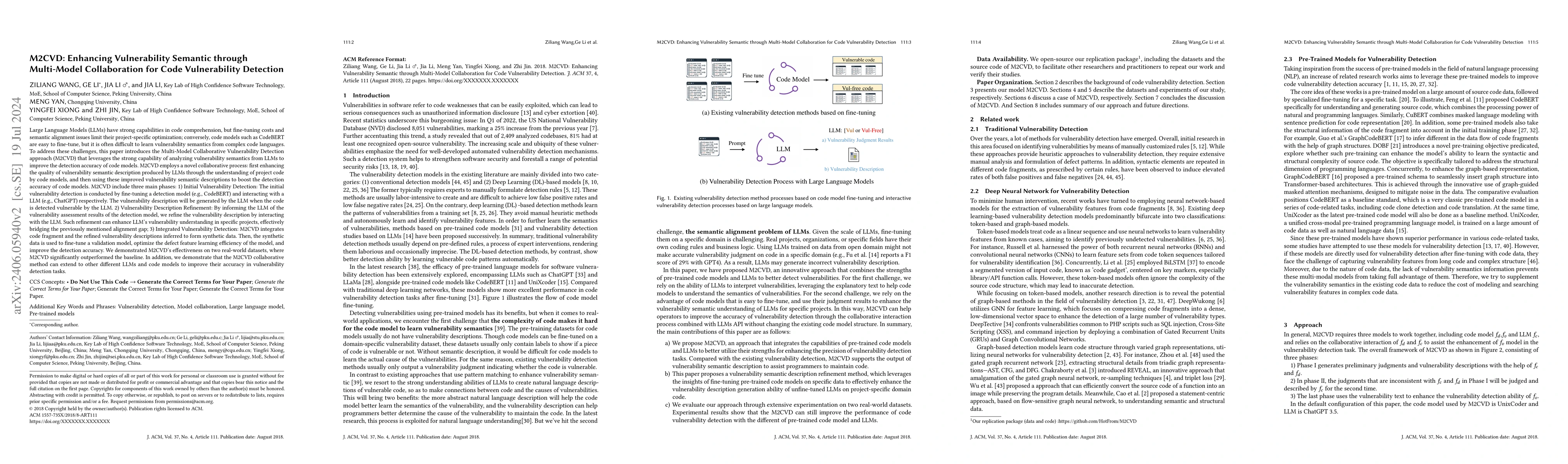 The paper introduces M2CVD, a Multi-Model Collaborative Vulnerability Detection approach that combines the strengths of large language models (LLMs) for vulnerability semantics with code models for project-specific optimization, achieving superior code vulnerability detection accuracy over baseline methods. The approach enhances vulnerability descriptions from LLMs with code model insights, demonstrating significant improvements on real-world datasets.