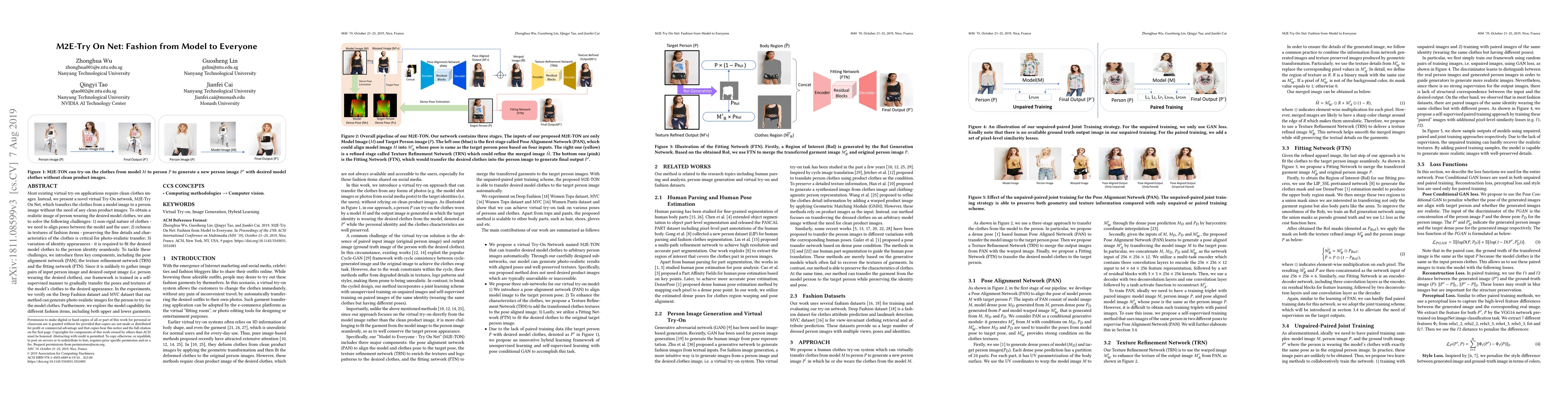 The M2E-Try On Net presents a novel virtual try-on network that transfers clothes from model images to person images without requiring clean product images. It addresses challenges like pose alignment, texture preservation, and identity fitting using a self-supervised approach, and demonstrates photo-realistic results on various fashion items.